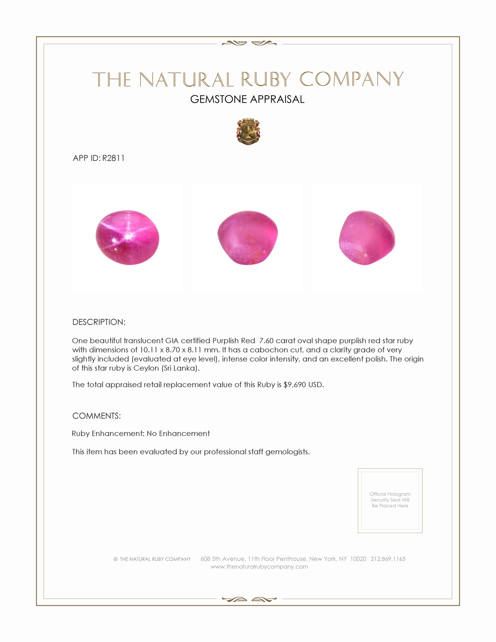 The Natural Ruby Company is committed to offering gems of superior quality and authenticity, where each piece carries with it not only beauty but also a story of origin and artisanship. This 7.60 carat oval-shaped purplish-red star ruby personifies the pinnacle of elegance and is a true testament to the grandeur found within Earth’s natural bounty. Whether being contemplated for the creation of bespoke jewelry or as a standalone treasure, this ruby promises to be an object of enduring admiration and value.
