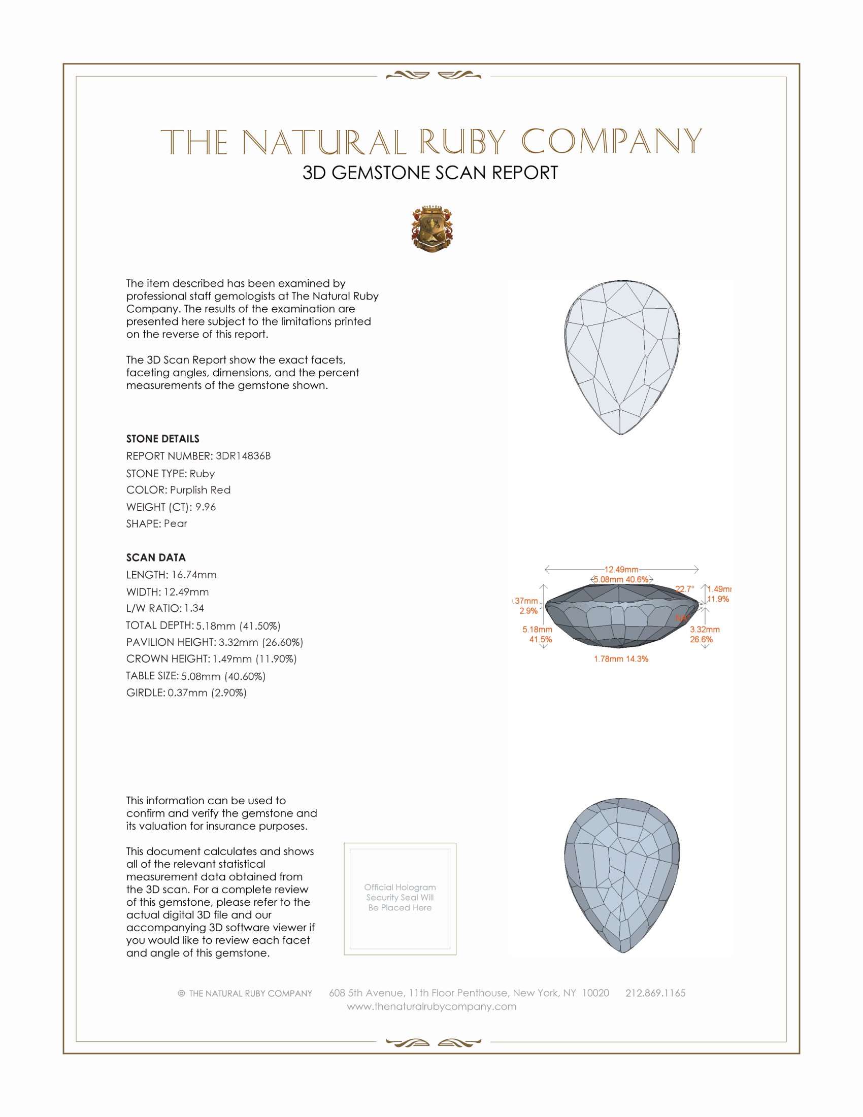 In the realm of timeless elegance, few treasures rival the enchanting allure of a resplendent ruby. At The Natural Ruby Company, we present to you a magnificent gemstone that epitomizes luxury at its finest - a transparent 9.96 carat pear-shaped ruby graced with a purplish red hue that possesses a magical charm all its own. Sourced from the storied lands of Mozambique, a region renowned for yielding rubies of unparalleled quality, this extraordinary gem promises to elevate custom jewelry into the realm of extraordinary artistry.