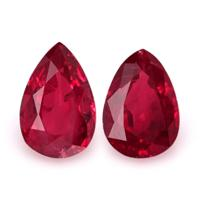 This matched pair of pear shaped red rubies presents well defined proportions and consistent visual character, supplied by The Natural Ruby Company. The pair weighs 0.45 carats and 0.50 carats respectively, with measured dimensions of 5.69 x 4.00 x 2.37 mm and 6.00 x 3.96 x 2.59 mm. Each stone is cut in a mixed brilliant style to balance internal reflection and face up brilliance, and both exhibit vivid color intensity with excellent polish. Clarity is graded as very very slightly included evaluated at eye level, indicating that inclusions do not materially affect the stones appearance in typical jewelry settings. Enhancement is limited to traditional heat treatment, and the rubies originate from Mozambique, a source known for producing vibrant commercial and high end material.