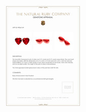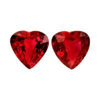 The beautiful, transparent pair of rubies are 0.75 carats and 0.75 carats respectively. They are heart shape red rubies, with the dimensions of 6.13 x 6.04 x 2.75 mm and 6.02 x 6.01 x 2.82 mm and are mixed brilliant cut, have a clarity grade of eye clean (evaluated at eye level), vivid color intensity, and an excellent polish. The origin of this pair of rubies is Mozambique.