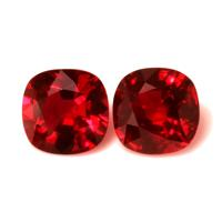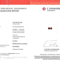 The beautiful, transparent C.Dunaigre certified Vivid Red “Pigeon’s Blood” pair of rubies are 1.25 carats and 1.14 carats respectively. They are cushion shape red rubies, with the dimensions of 6.43 x 6.43 x 3.60 mm and 6.50 x 6.47 x 3.49 mm and are mixed brilliant cut, have a clarity grade of very slightly included (evaluated at eye level), vivid color intensity, and an excellent polish. The origin of this pair of rubies is Mozambique.