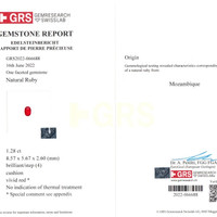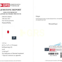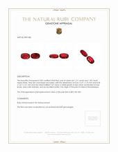 Stone Type: Ruby, Weight: 1.21 carats and 1.28 carats, Enhancement: None, Origin: Mozambique, Clarity: Eye Clean (evaluated at eye level), Color: Red, Intensity: Vivid, Shape: Oval, Dimension: 8.54 x 5.47 x 2.76 mm and 8.58 x 5.67 x 2.61 mm, Transparency: Transparent, Cut: Mixed Brilliant Cut