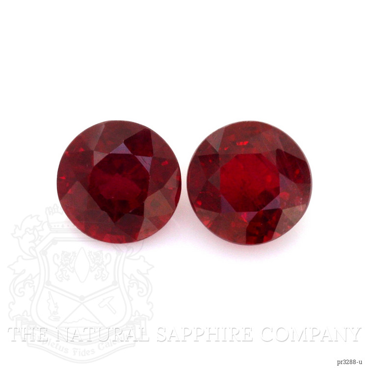 The beautiful, transparent pair of rubies are 1.21 carats and 1.31 carats respectively. They are round shape red rubies, with the dimensions of 6.29 x 6.29 x 3.86 mm and 6.28 x 6.28 x 3.87 mm and are mixed brilliant cut, have a clarity grade of eye clean (evaluated at eye level), vivid color intensity, and an excellent polish. The origin of this pair of rubies is Mozambique.