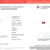 The beautiful, transparent C.Dunaigre certified Vivid Red pair of rubies are 1.53 carats and 1.50 carats respectively. They are oval shape red rubies, with the dimensions of 8.42 x 5.98 x 3.37 mm and 8.39 x 5.97 x 3.11 mm and are mixed brilliant cut, have a clarity grade of eye clean (evaluated at eye level), vivid color intensity, and an excellent polish. The origin of this pair of rubies is Mozambique.