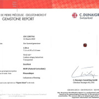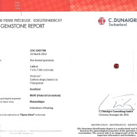 The beautiful, transparent C.Dunaigre certified Vivid Red “Pigeon’s Blood” pair of rubies are 1.64 carats and 1.50 carats respectively. They are cushion shape red rubies, with the dimensions of 7.09 x 7.07 x 3.65 mm and 7.11 x 6.95 x 3.14 mm and are mixed brilliant cut, have a clarity grade of eye clean (evaluated at eye level), vivid color intensity, and an excellent polish. The origin of this pair of rubies is Mozambique.
