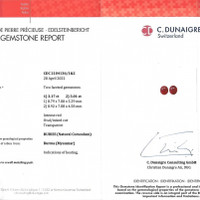 The beautiful, transparent C.Dunaigre certified Intense Red pair of rubies are 3.17 carats and 3.01 carats respectively. They are oval shape red rubies, with the dimensions of 8.79 x 7.88 x 5.29 mm and 8.92 x 7.88 x 4.58 mm and are brilliant cut, have a clarity grade of slightly included (evaluated at eye level), intense color intensity, and an excellent polish. The origin of this pair of rubies is Burma (Myanmar).
