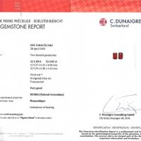 The beautiful, transparent pair of rubies are 3.02 carats and 3.18 carats respectively. They are emerald cut shape red rubies, with the dimensions of 9.29 x 6.38 x 4.43 mm and 9.37 x 6.31 x 4.84 mm and are step cut, have a clarity grade of very slightly included (evaluated at eye level), vivid color intensity, and an excellent polish. The origin of this pair of rubies is Mozambique.