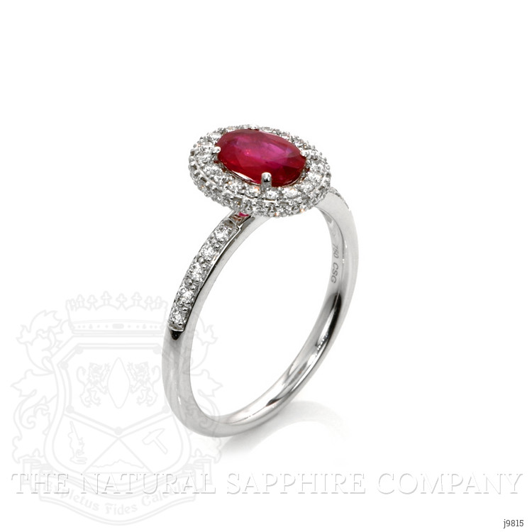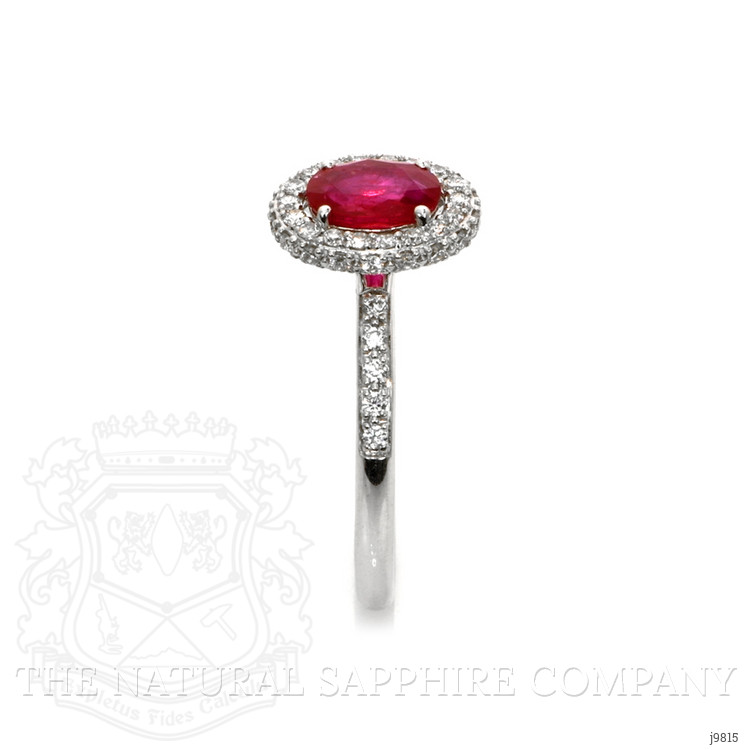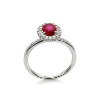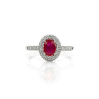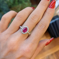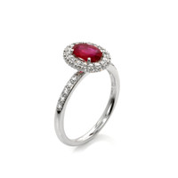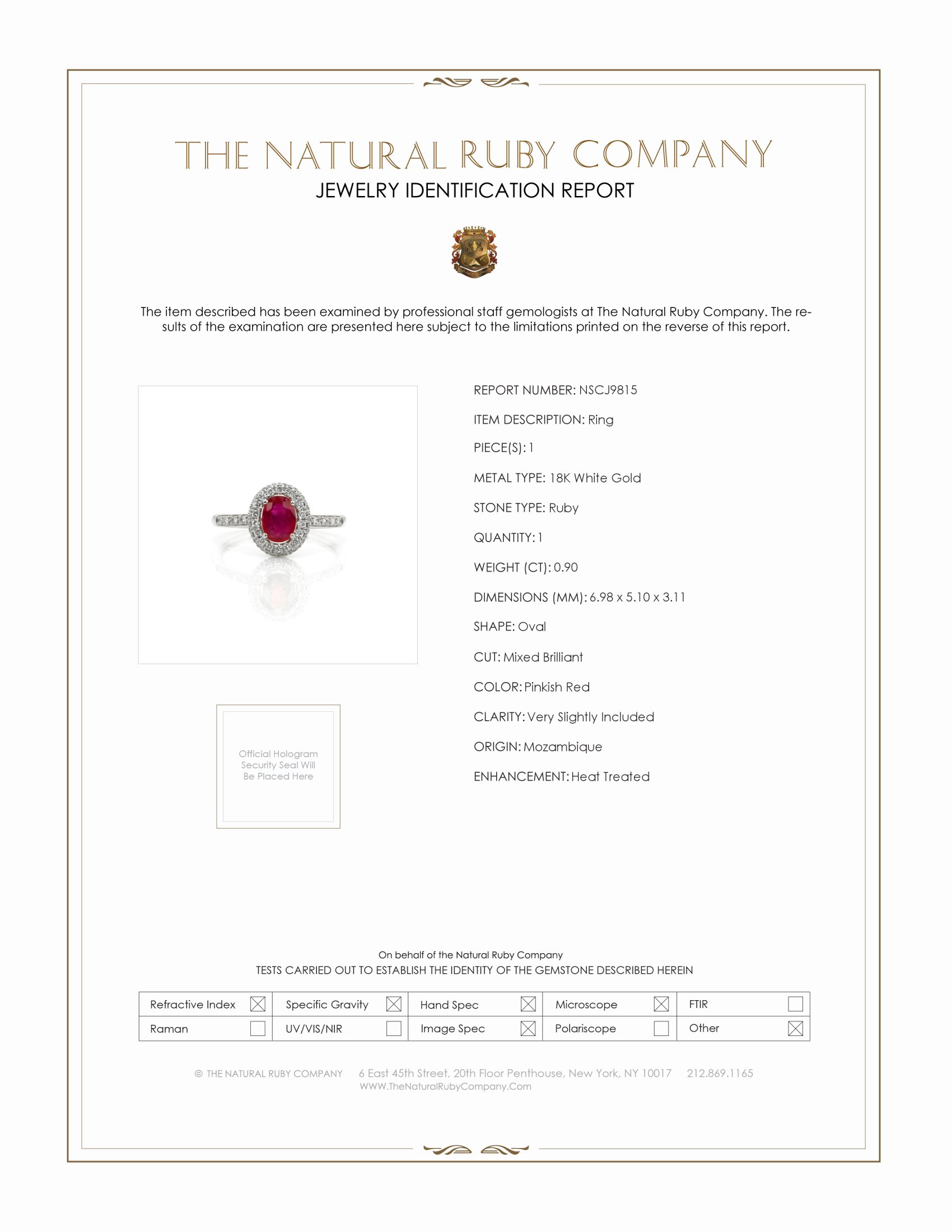 The ring primarily features a beautiful, transparent 0.90 carat oval shape pinkish red ruby with the dimensions of 6.98 x 5.10 x 3.11 mm and is mixed brilliant cut. It has a clarity grade of very slightly included (evaluated at eye level), vivid color intensity, and an excellent polish. The origin of this ruby is Mozambique. Also featured in the ring are 28 white round shaped mixed brilliant cut diamonds, weighing a total of 0.34 carats. The diamonds have a clarity grade of vs1 - Very Slightly Included, F color. The ring is entirely set in 18K white gold.