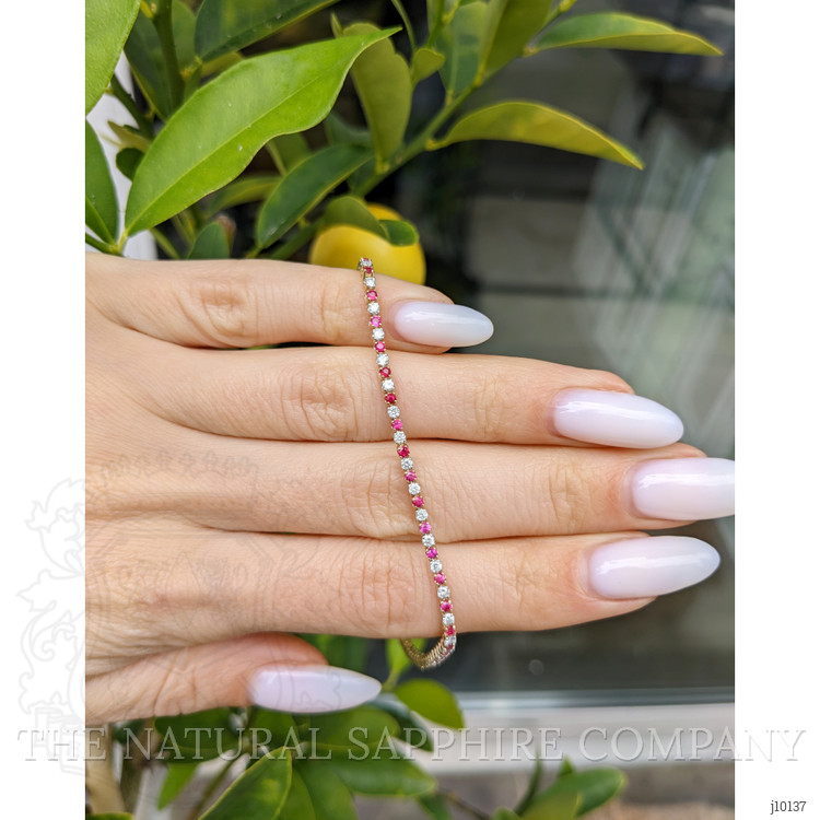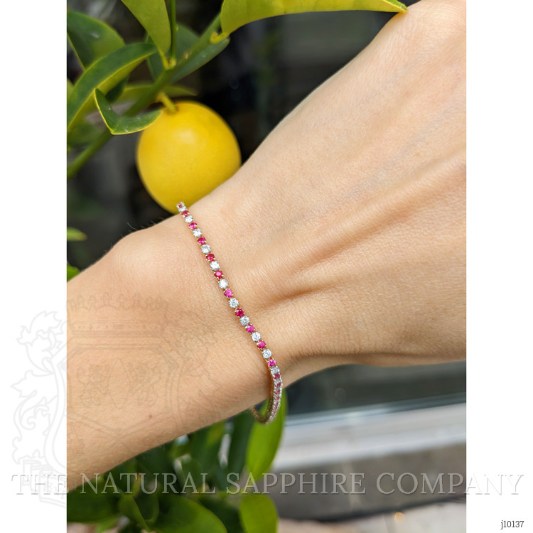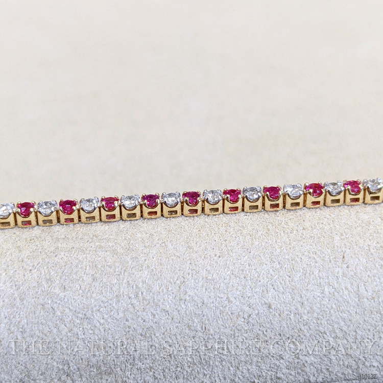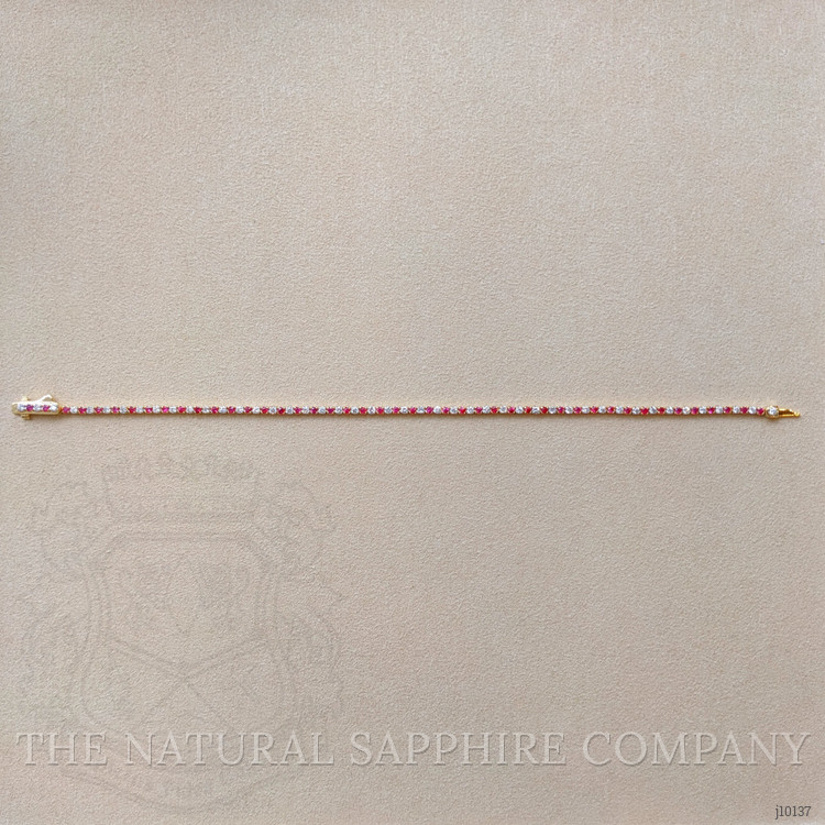 The following stones comprise the lovely bracelet and are entirely set in 14K yellow gold. The bracelet primarily features with 45 pinkish red round shaped mixed brilliant cut rubies, weighing a total of 1.08 carats. The rubies have a clarity grade of slightly included, and color saturation of vivid. The origin of these rubies is Mozambique. Also featured in the bracelet are 46 white round shaped brilliant cut natural diamonds, weighing a total of 0.96 carats. The natural diamonds have a clarity grade of si2 - Slightly Included., F color