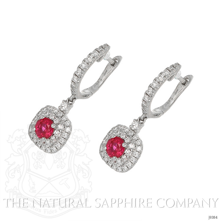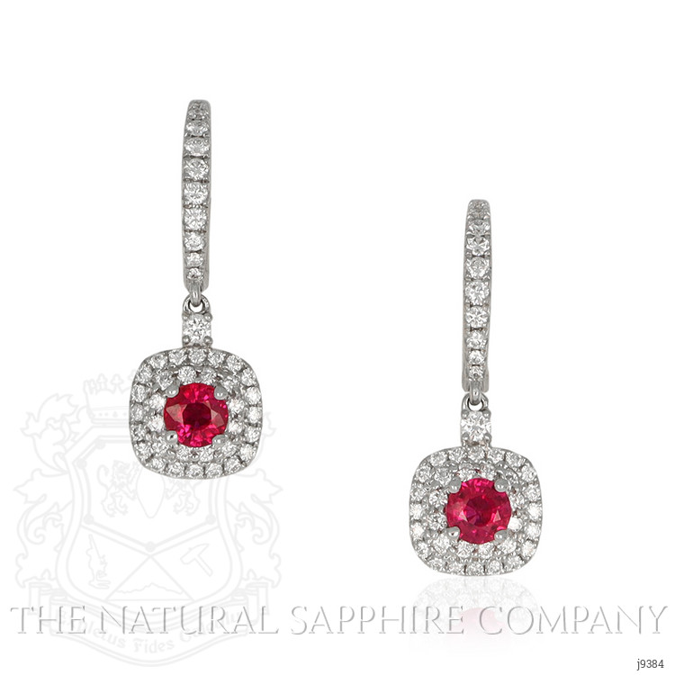 The earrings primarily feature a beautiful, transparent pair of rubies that are 0.82 total carat weight. They are round shape pinkish red rubies, with the dimensions of 4.39 x 4.32 x 2.78 mm and are mixed brilliant cut, have a clarity grade of very slightly included (evaluated at eye level), vivid color intensity, and an excellent polish. The origin of this pair of rubies is Mozambique. Also featured in the earrings are 86 white round shaped mixed brilliant cut natural diamonds, weighing a total of 0.70 carats. The natural diamonds have a clarity grade of vs1 - Very Slightly Included., F color The earrings are entirely set in 18K white gold.