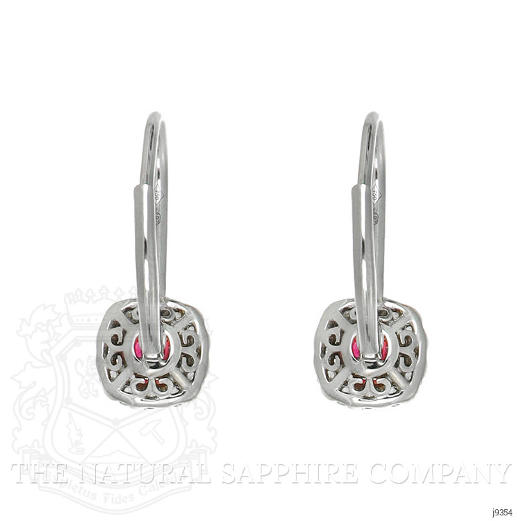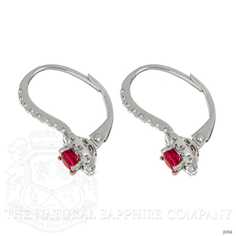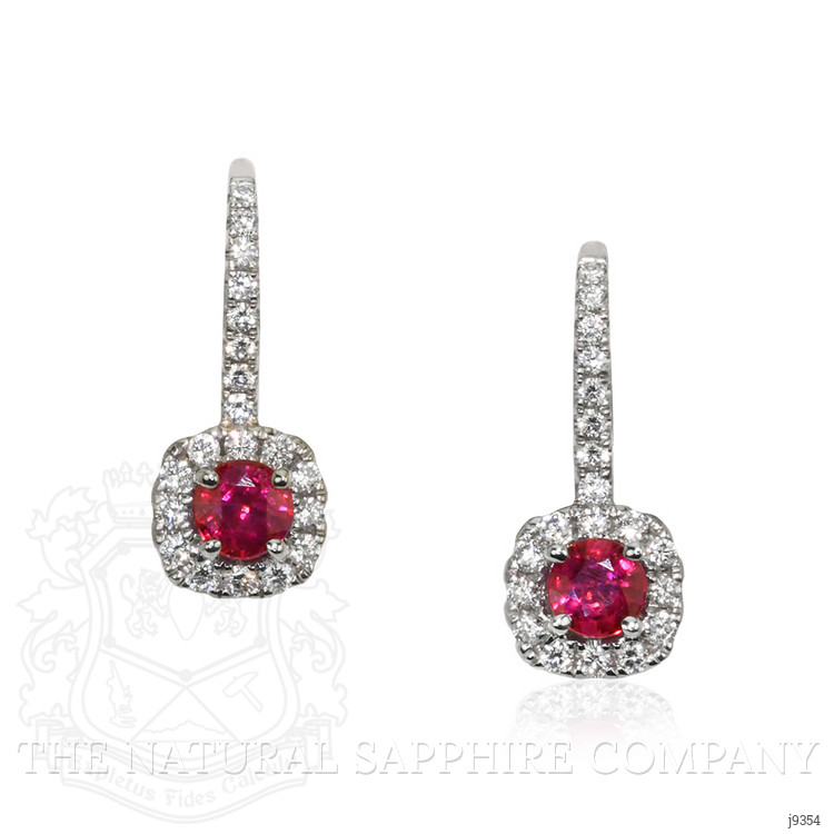 The earrings primarily feature a beautiful, transparent pair of rubies that are 0.95 total carat weight. They are round shape pinkish red rubies, with the dimensions of 4.50 x 4.50 x 3.20 mm and are mixed brilliant cut, have a clarity grade of very slightly included (evaluated at eye level), vivid color intensity, and an excellent polish. The origin of this pair of rubies is Mozambique. Also featured in the earrings are 40 white round shaped mixed brilliant cut natural diamonds, weighing a total of 0.45 carats. The natural diamonds have a clarity grade of vs1 - Very Slightly Included., F color The earrings are entirely set in 18K white gold.