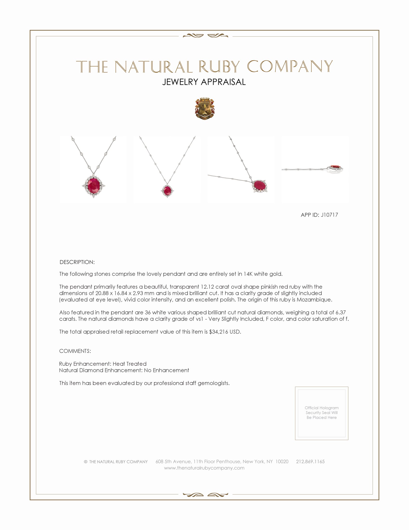 12.12 Ct. Ruby Natural Diamond Antique Style Pendant, 14K White Gold