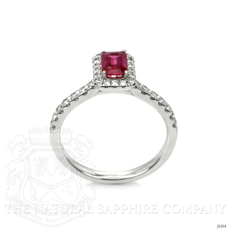The ring primarily features a beautiful, transparent 0.54 carat emerald cut shape pinkish red ruby with the dimensions of 6.23 x 4.16 x 2.58 mm and is step cut. It has a clarity grade of very slightly included (evaluated at eye level), vivid color intensity, and an excellent polish. The origin of this ruby is Mozambique. Also featured in the ring are 32 white round shaped mixed brilliant cut natural diamonds, weighing a total of 0.35 carats. The natural diamonds have a clarity grade of vs1 - Very Slightly Included., F color The ring is entirely set in 18K white gold.