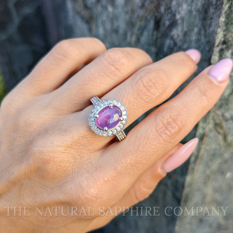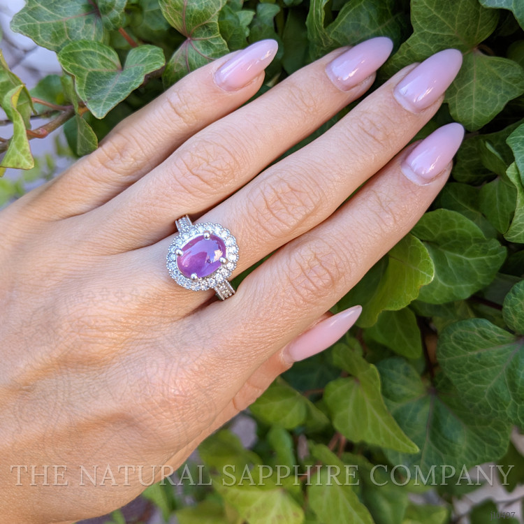 The ring presented is crafted entirely in 14K white gold, showcasing a stylish and elegant design. At its center, the piece features an oval-cut gemstone, noted for its rich purple hue. The gemstone is intricately surrounded by a halo of meticulously set diamonds, which enhance its brilliance and overall aesthetic appeal. The oval cut of the central gemstone offers a unique lighting performance compared to other popular styles, such as round or princess cuts. This is due to its elongated shape, which creates a sophisticated play of light and depth, delivering a distinctive sparkle that differs from the symmetrical brilliance of round cuts and the exceptional fire characteristic of princess cuts. The band itself is also adorned with diamonds, adding to the luxurious appearance of the ring and ensuring that it catches the light beautifully from every angle. The combination of the vivid center gemstone with the subtle shimmer of white diamonds and the lustrous white gold setting results in a timeless piece that balances sophistication and contemporary design perfectly.