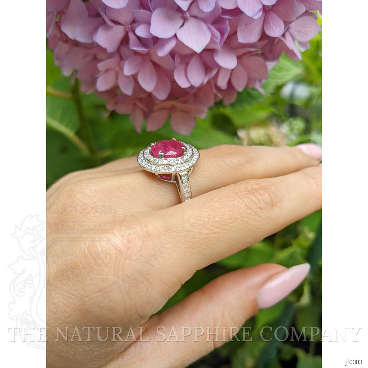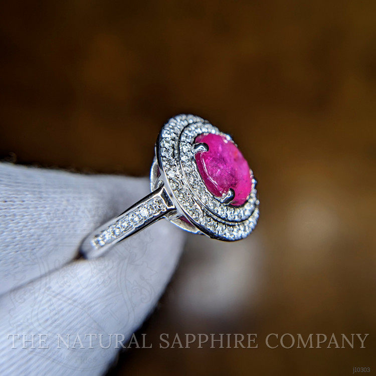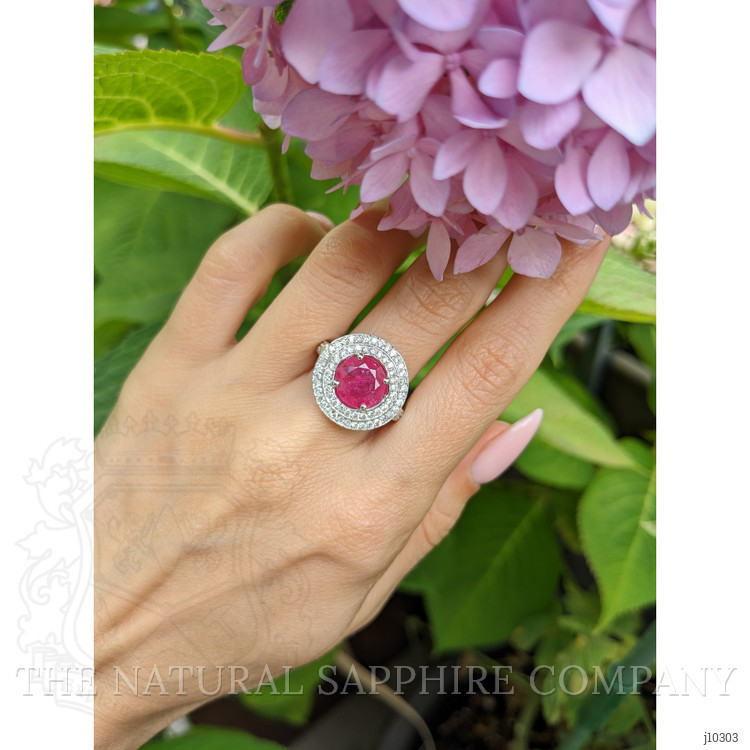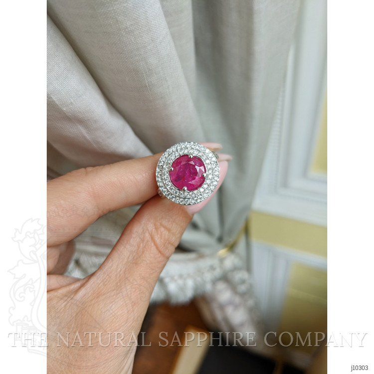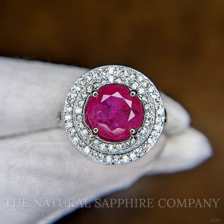 Indulge in sheer luxury and timeless elegance with this stunning 14K white gold ring. At its heart lies a breathtaking transparent 4.50 carat round shape purplish red Ruby from the lush landscapes of Vietnam. GIA certified and embodying a mixed brilliant cut, this exquisite gemstone measures 9.18 x 9.39 x 5.37 mm, boasting a captivating vivid color intensity that enchants with every glance. The Ruby's slightly included clarity grade, evaluated at eye level, complements its excellent polish, making it a mesmerizing focal point.Encircling the Ruby are 78 white round shaped diamonds, meticulously chosen and precisely set, together totaling 1.00 carats. These mixed brilliant cut diamonds shimmer with a clarity grade of VS1, ensuring they flawlessly luminize the Ruby's already vivid presence. Every diamond sparkles with exceptional brilliance, enhancing the ring's overall splendor.This luxurious piece stands out with its unique design elements—including intricate filigree work that exudes sophistication and elegance. The craftsmanship is unparalleled, showcasing an eye for detail and a dedication to all things beautiful. Each gemstone is carefully integrated into the setting, ensuring harmony and balance. The substantial 14K white gold band not only provides strength and durability but also adds a sleek, modern aesthetic.Whether you are celebrating a special occasion, expressing your unique style, or seeking an heirloom piece to cherish for generations, this ring promises to bring joy and admiration. Its timeless design and unparalleled craftsmanship make it a true testament to luxury. Indulge in the exquisite beauty of meticulous artistry and top-tier gemstones. Make this radiant ring a part of your story, and let it bring happiness and excitement into your life, enhancing every moment with its dazzling charm.