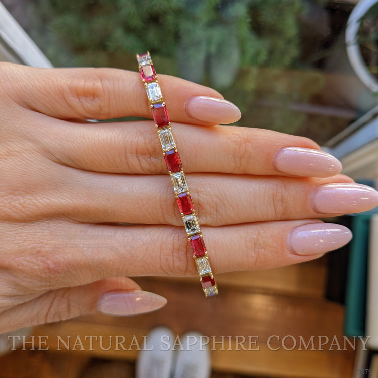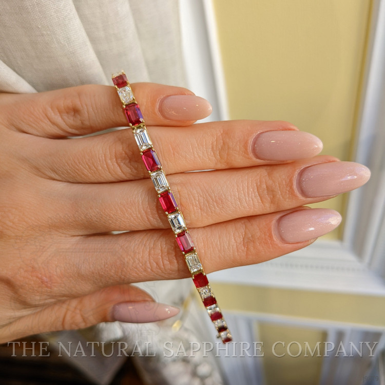 The following stones comprise the lovely bracelet and are entirely set in 18K yellow gold. The bracelet primarily features with 15 red emerald cut shaped mixed brilliant cut rubies, weighing a total of 8.19 carats. The rubies have a clarity grade of very slightly included, and color saturation of vivid. The origin of these rubies is Mozambique. Also featured in the bracelet are 14 white emerald cut shaped brilliant cut natural diamonds, weighing a total of 5.13 carats. The natural diamonds have a clarity grade of vs2 - Very Slightly Included., F color