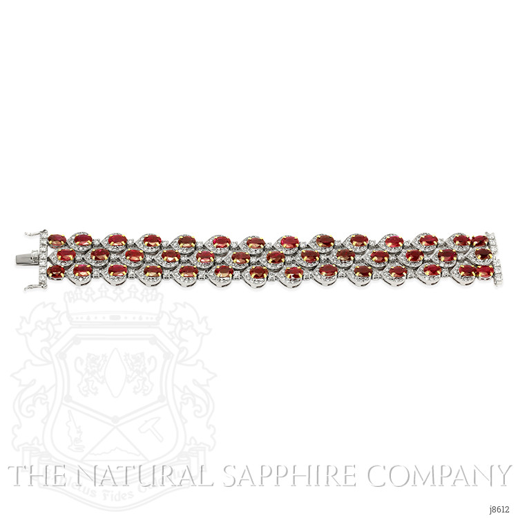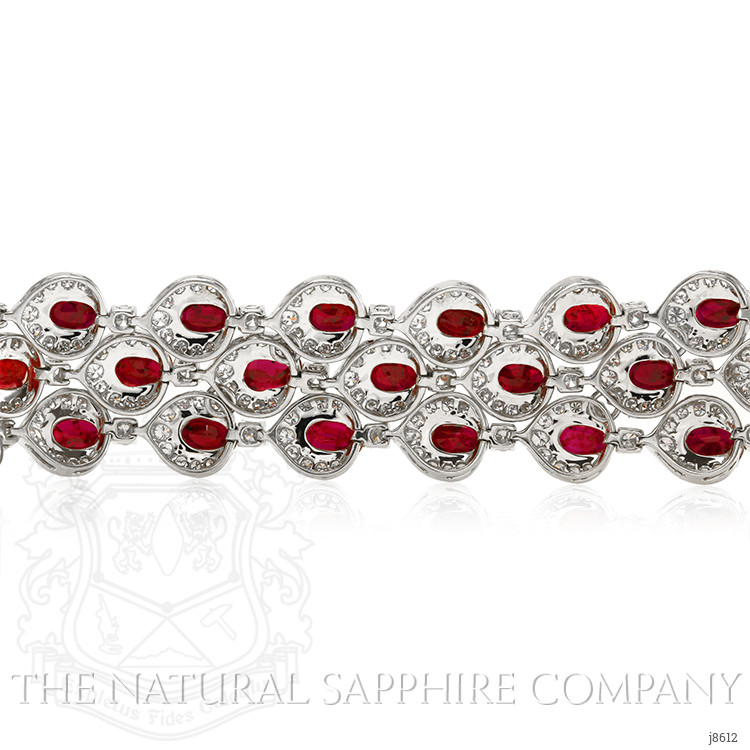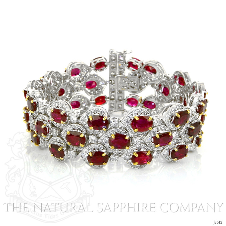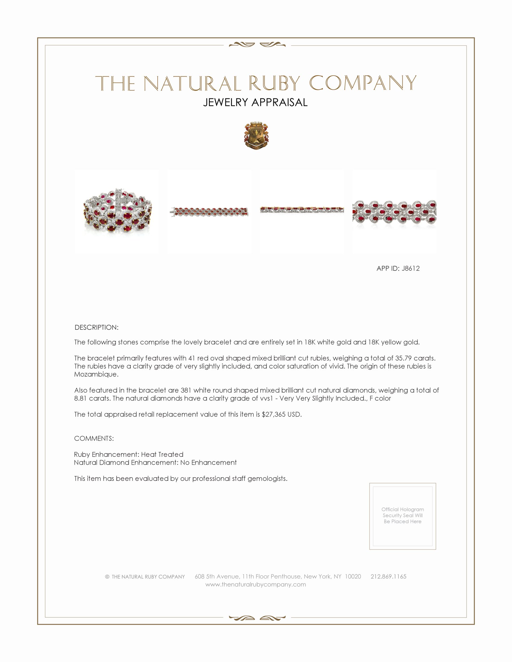The following stones comprise the lovely bracelet and are entirely set in 18K white gold and 18K yellow gold. The bracelet primarily features with 41 red oval shaped mixed brilliant cut rubies, weighing a total of 35.79 carats. The rubies have a clarity grade of very slightly included, and color saturation of vivid. The origin of these rubies is Mozambique. Also featured in the bracelet are 381 white round shaped mixed brilliant cut natural diamonds, weighing a total of 8.81 carats. The natural diamonds have a clarity grade of vvs1 - Very Very Slightly Included., F color