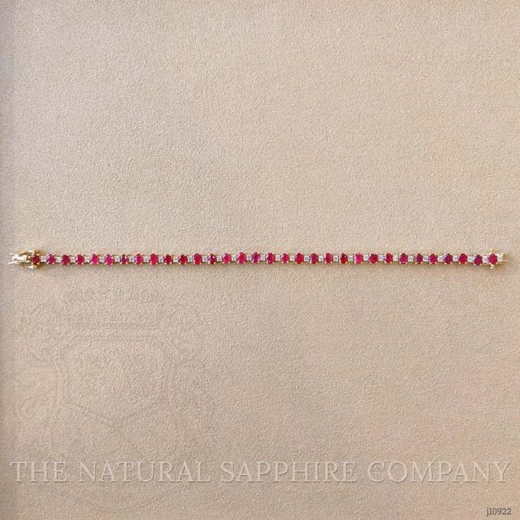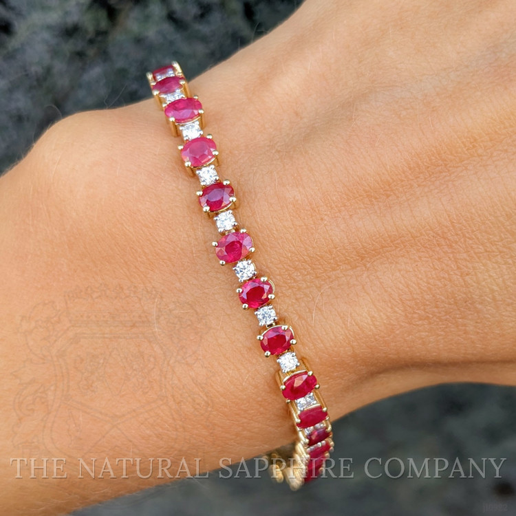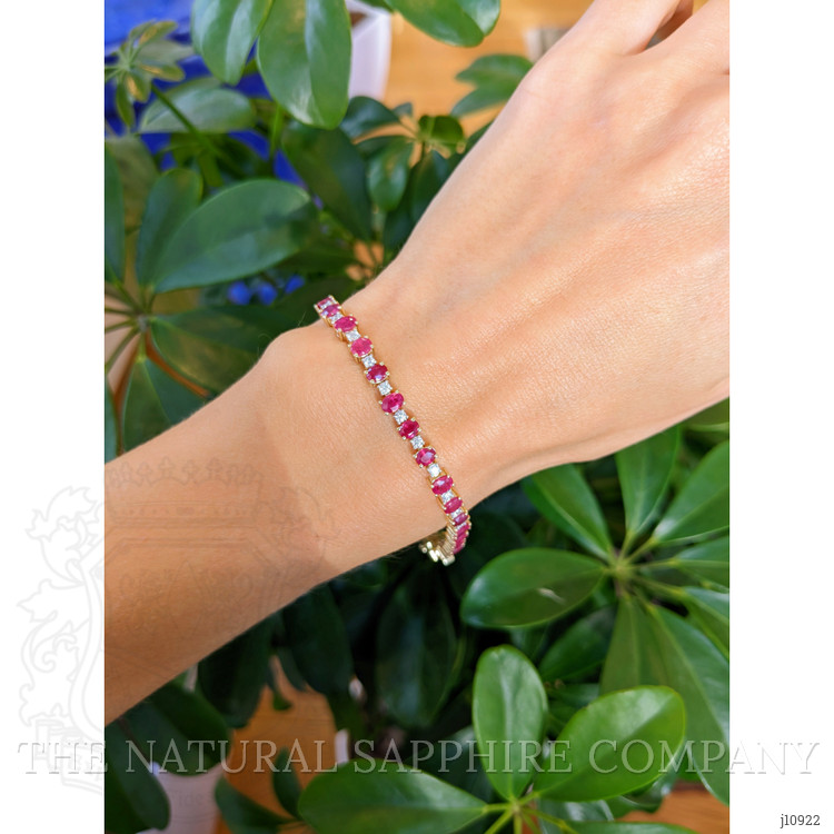 From a clarity perspective the rubies display the kind of eye clean appearance that collectors and connoisseurs seek, slight internal characteristics that do not interrupt the overall clarity but instead confirm natural origin and authenticity. These inclusions do not dull the rich red, they lend personality and a sense of time to each stone, while the diamonds read as lively and free of visible cloudiness, their clarity allowing maximum reflection and sparkling contrast. Together they form a classic tennis style line that balances color saturation with optical purity, creating a bracelet that stands out for its harmony of tone and light rather than for any single flashy element. This piece wears with effortless grace, suitable for formal evenings and for daily moments when an understated legacy is desired, it will pair beautifully with other yellow gold pieces and will hold meaningful presence as a gift for milestone occasions, or as the beginning of a personal collection meant to be passed down for generations, care is simple, occasional gentle cleaning will maintain the radiance, and the design ensures enduring beauty that honors the ancient pedigree of these two legendary gems.