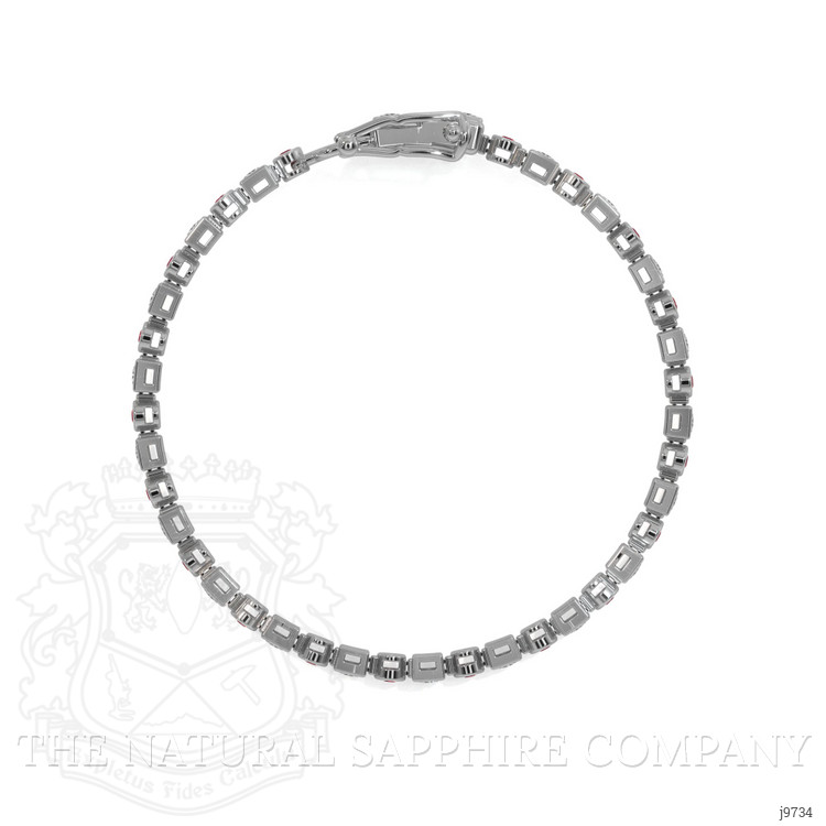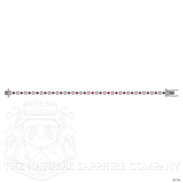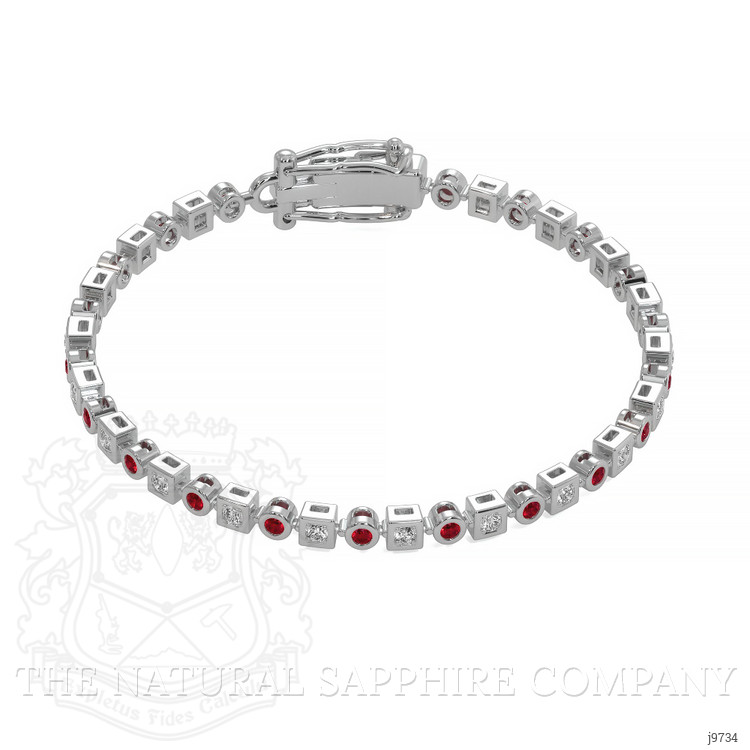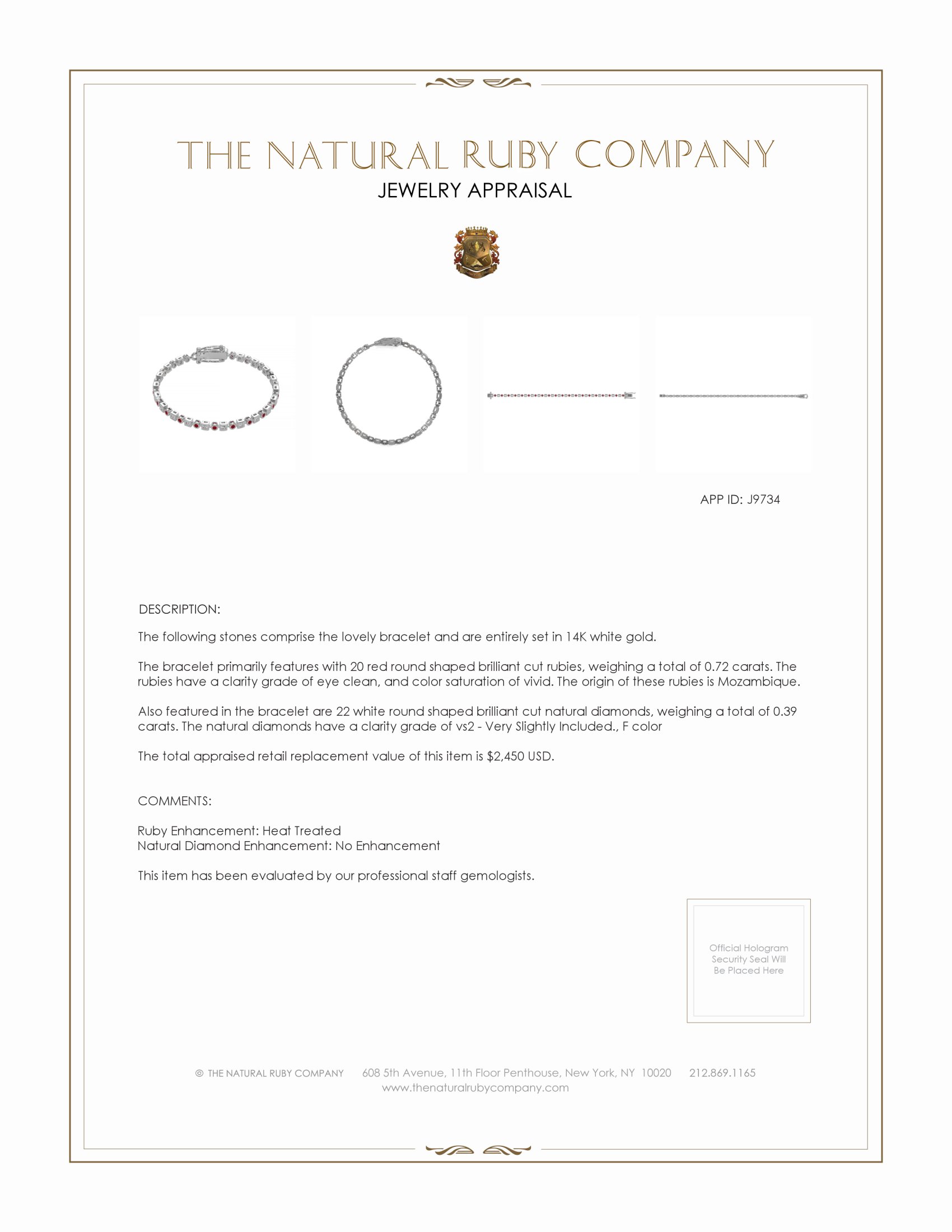 The following stones comprise the lovely bracelet and are entirely set in 14K white gold. The bracelet primarily features with 20 red round shaped brilliant cut rubies, weighing a total of 0.72 carats. The rubies have a clarity grade of eye clean, and color saturation of vivid. The origin of these rubies is Mozambique. Also featured in the bracelet are 22 white round shaped brilliant cut natural diamonds, weighing a total of 0.39 carats. The natural diamonds have a clarity grade of vs2 - Very Slightly Included., F color