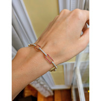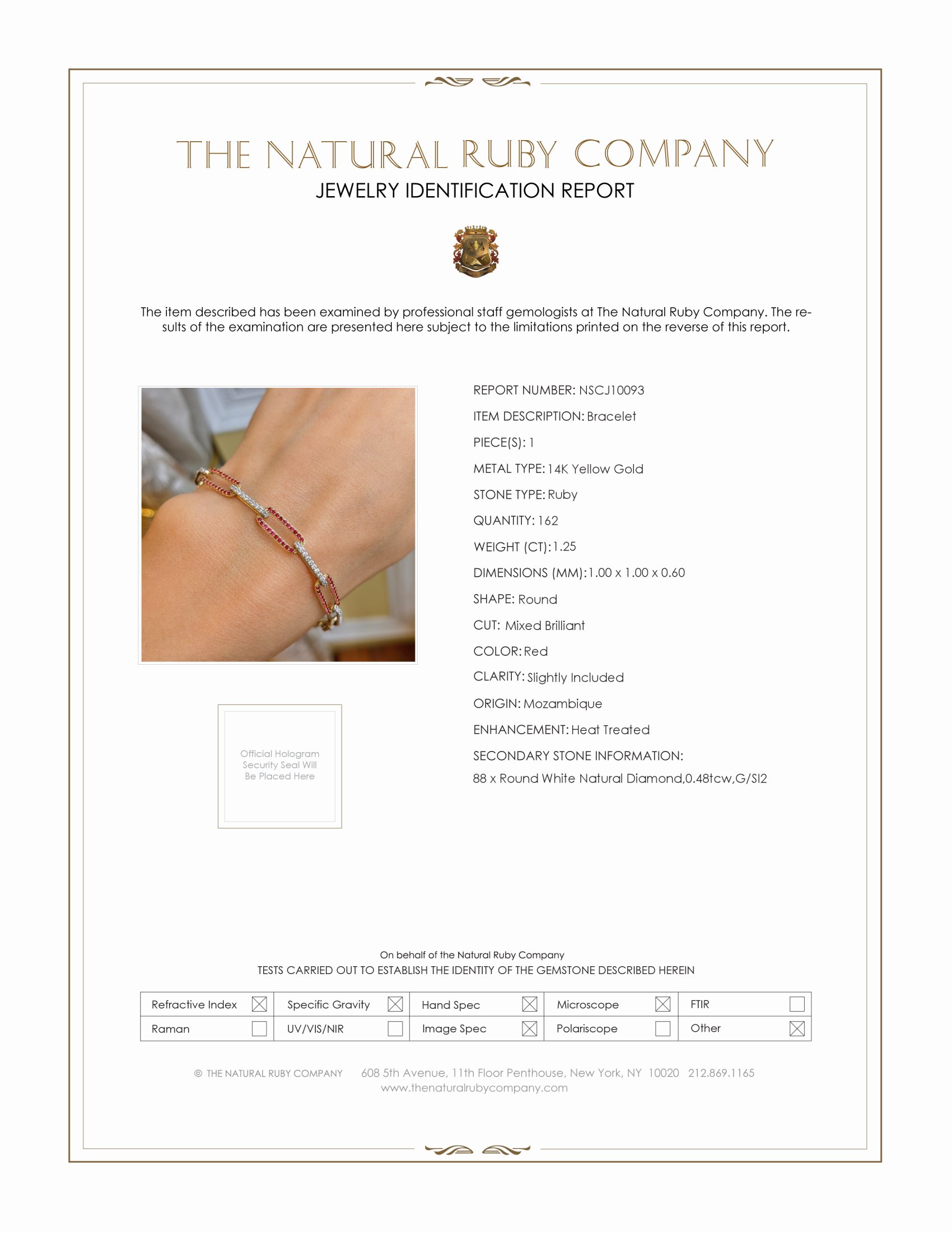 In addition to the rubies, the bracelet features 88 white round-shaped, brilliant-cut natural diamonds. Weighing a total of 0.48 carats, these diamonds possess a clarity grade of SI2, showcasing a delicate interplay with the lustrous yellow gold. With a G color grade, they add exceptional sparkle, enhancing the bracelet's luxury and refinement.