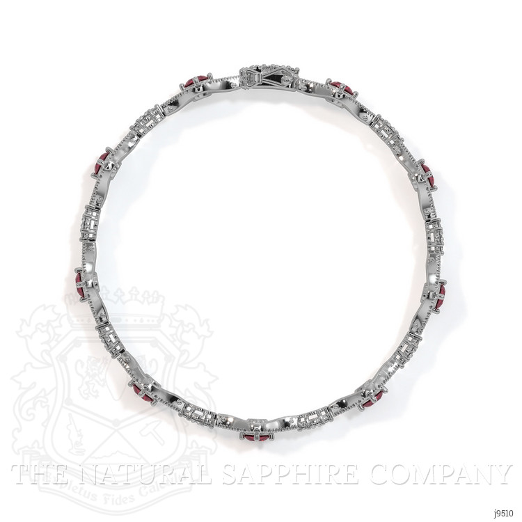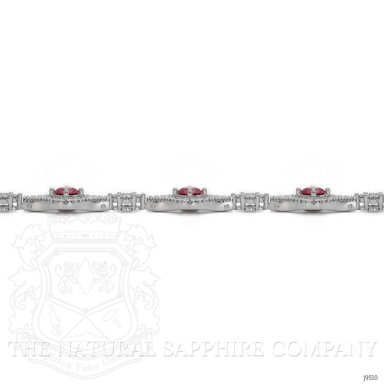 The Natural Ruby Company is proud to present an exquisite bracelet that seamlessly marries timeless design with exceptional quality, destined to be a cherished piece for years to come. Crafted in 18K white gold, this bracelet is a testament to the allure of fine jewelry, promising to captivate and delight the educated buyer. At the heart of this piece are nine round shaped brilliant cut Rubies, each carefully selected for their extraordinary characteristics and arranged to highlight their natural beauty. These Rubies, sourced from the renowned mines of Mozambique, weigh a total of 2.80 carats. Revered for their vivid color intensity, these gems boast a remarkable clarity grade of eye clean, ensuring a striking and unblemished appearance that draws the eye.