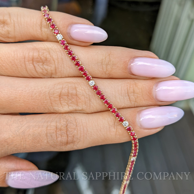 The following stones comprise the lovely bracelet and are entirely set in 14K yellow gold. The bracelet primarily features with 68 red round shaped mixed brilliant cut rubies, weighing a total of 3.39 carats. The rubies have a clarity grade of slightly included, and color saturation of vivid. The origin of these rubies is Mozambique. Also featured in the bracelet are 9 white round shaped brilliant cut natural diamonds, weighing a total of 0.36 carats. The natural diamonds have a clarity grade of si2 - Slightly Included., G color