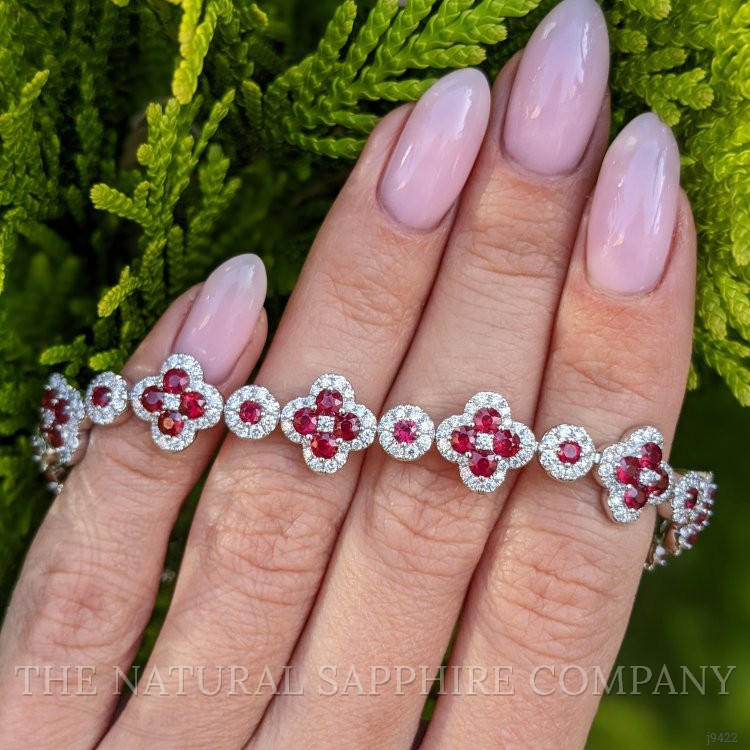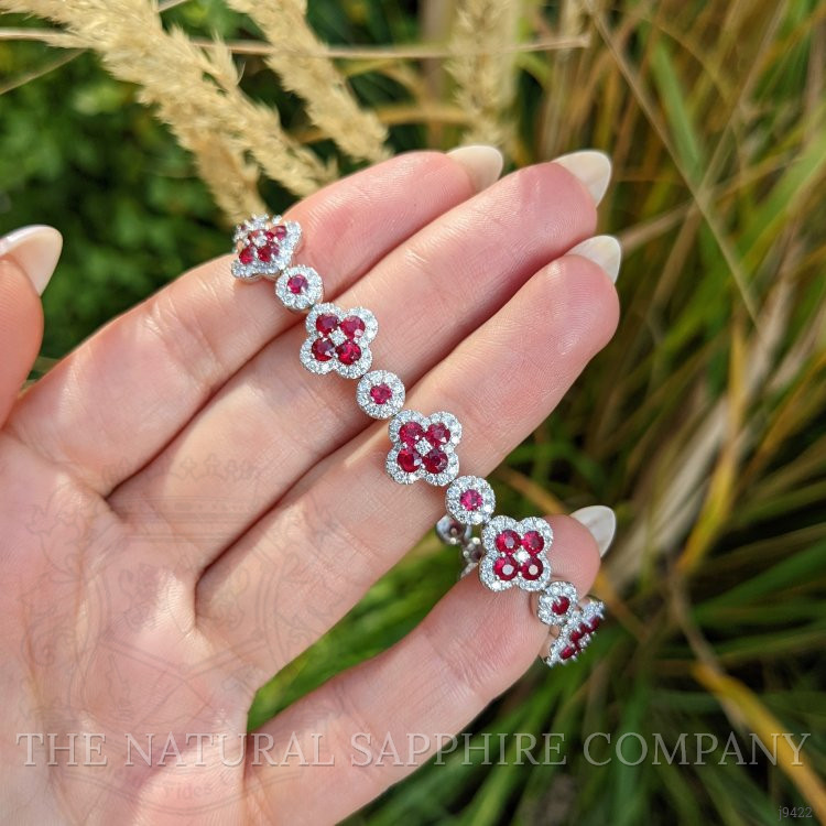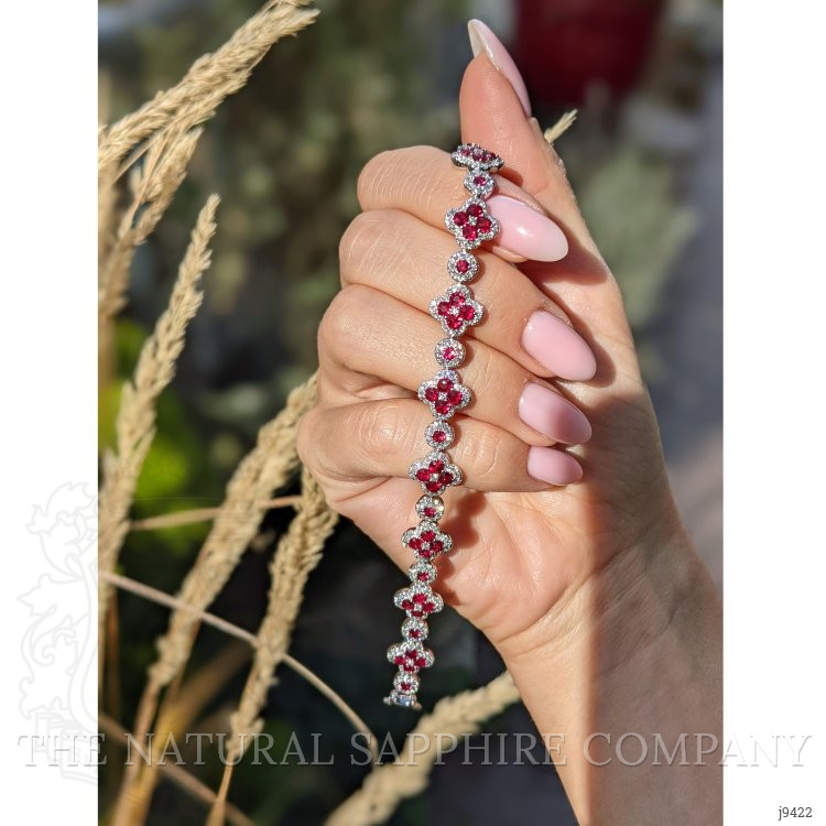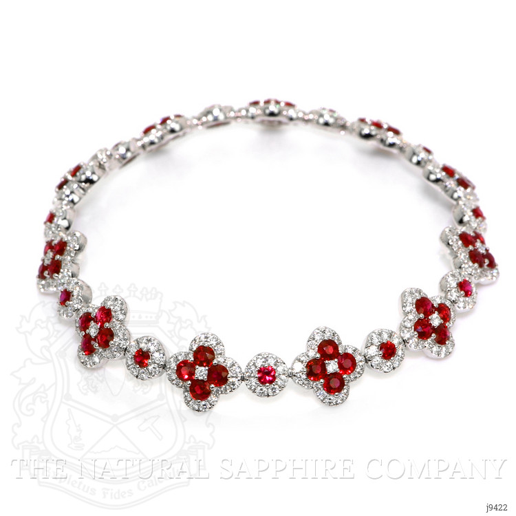 The following stones comprise the lovely bracelet and are entirely set in 18K white gold. The bracelet primarily features with 55 red round shaped brilliant cut rubies, weighing a total of 5.12 carats. The rubies have a clarity grade of eye clean, and color saturation of vivid. The origin of these rubies is Mozambique. Also featured in the bracelet are 319 white round shaped brilliant cut natural diamonds, weighing a total of 2.90 carats. The natural diamonds have a clarity grade of vs2 - Very Slightly Included., F color