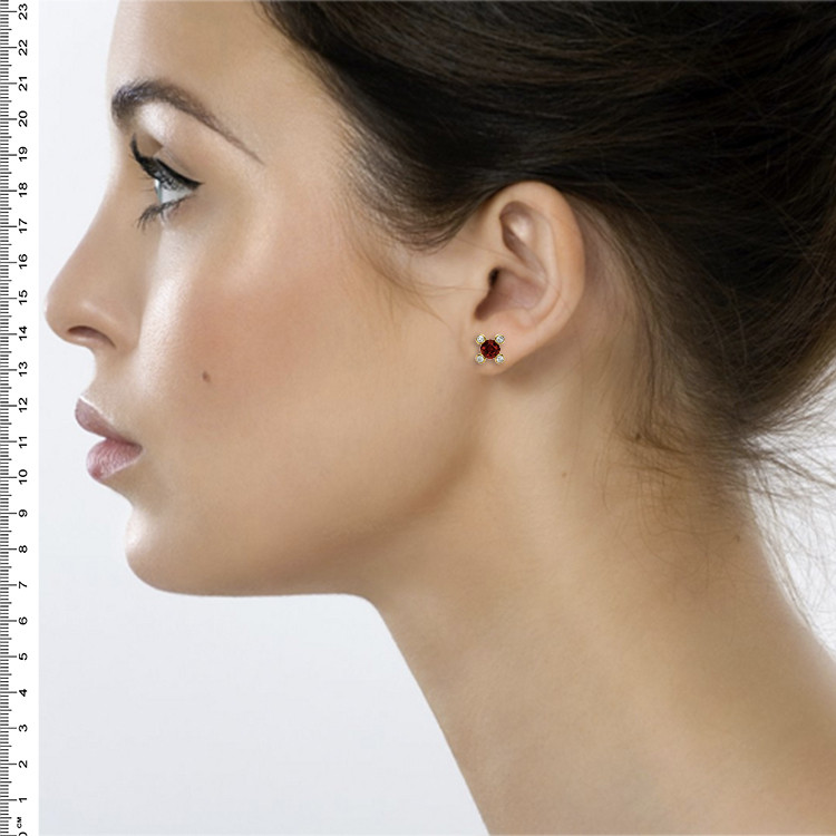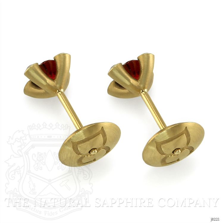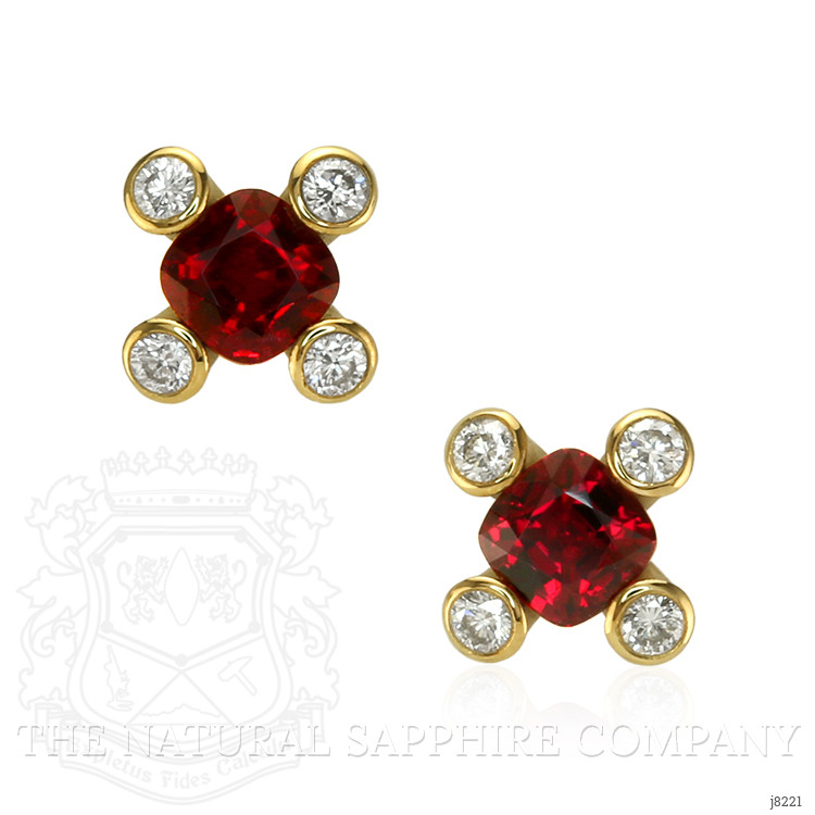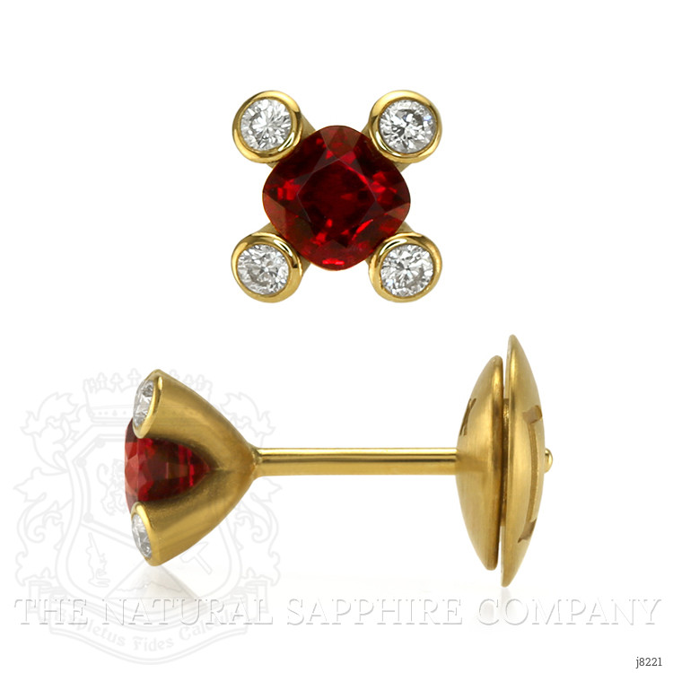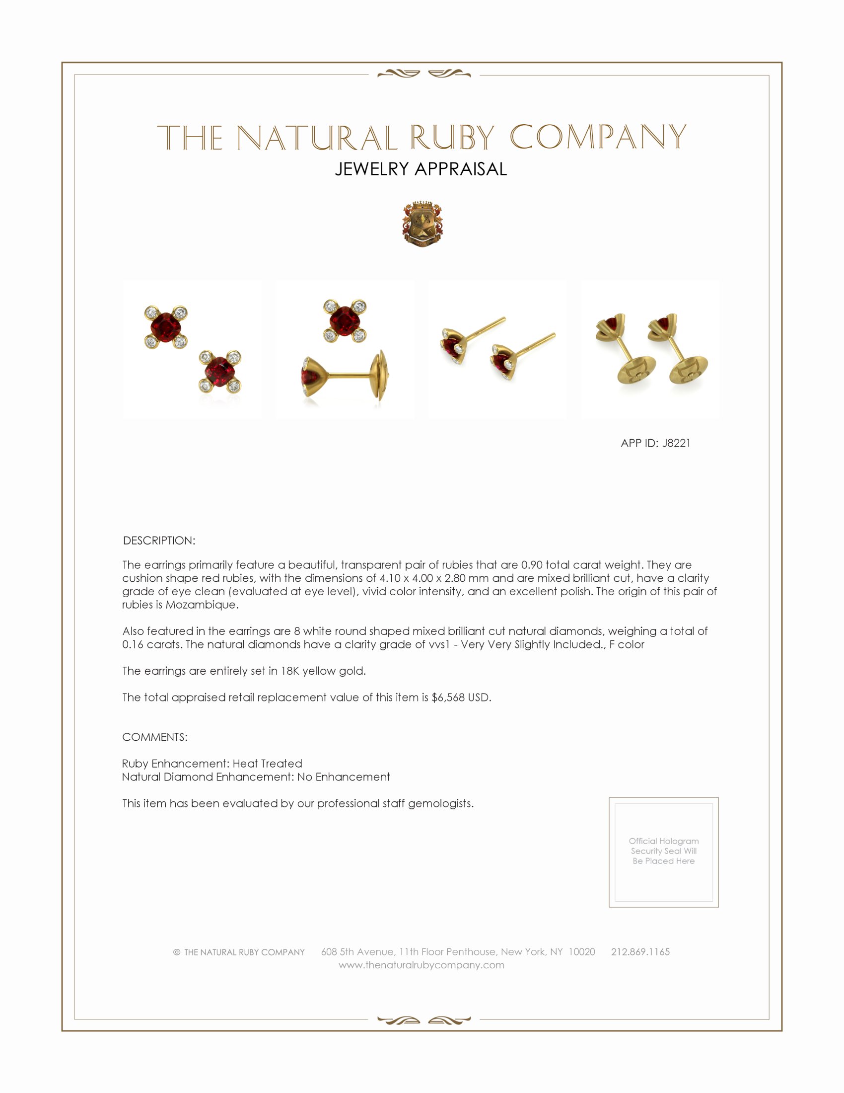 The earrings primarily feature a beautiful, transparent pair of rubies that are 0.90 total carat weight. They are cushion shape red rubies, with the dimensions of 4.10 x 4.00 x 2.80 mm and are mixed brilliant cut, have a clarity grade of eye clean (evaluated at eye level), vivid color intensity, and an excellent polish. The origin of this pair of rubies is Mozambique. Also featured in the earrings are 8 white round shaped mixed brilliant cut natural diamonds, weighing a total of 0.16 carats. The natural diamonds have a clarity grade of vvs1 - Very Very Slightly Included., F color The earrings are entirely set in 18K yellow gold.