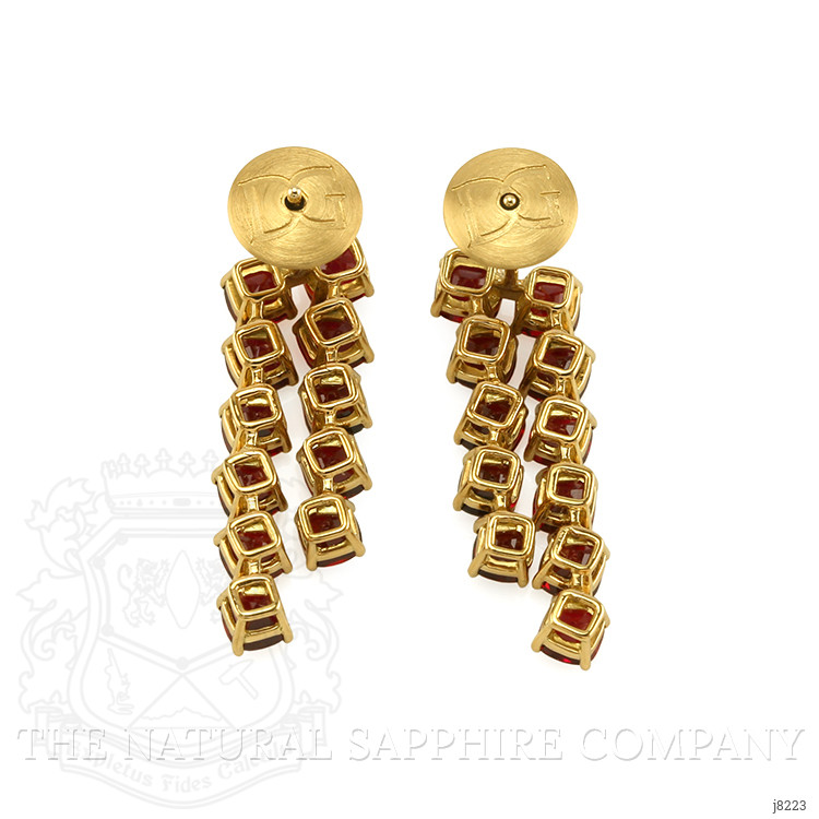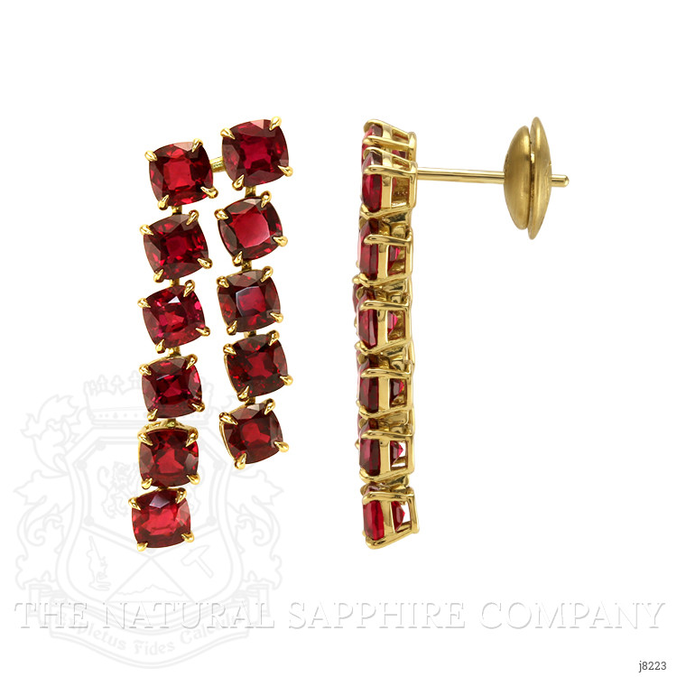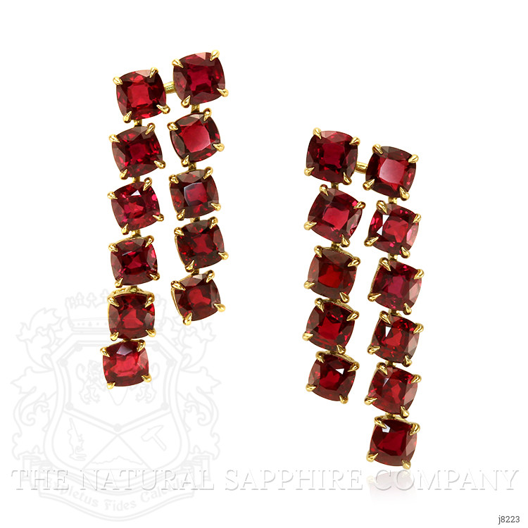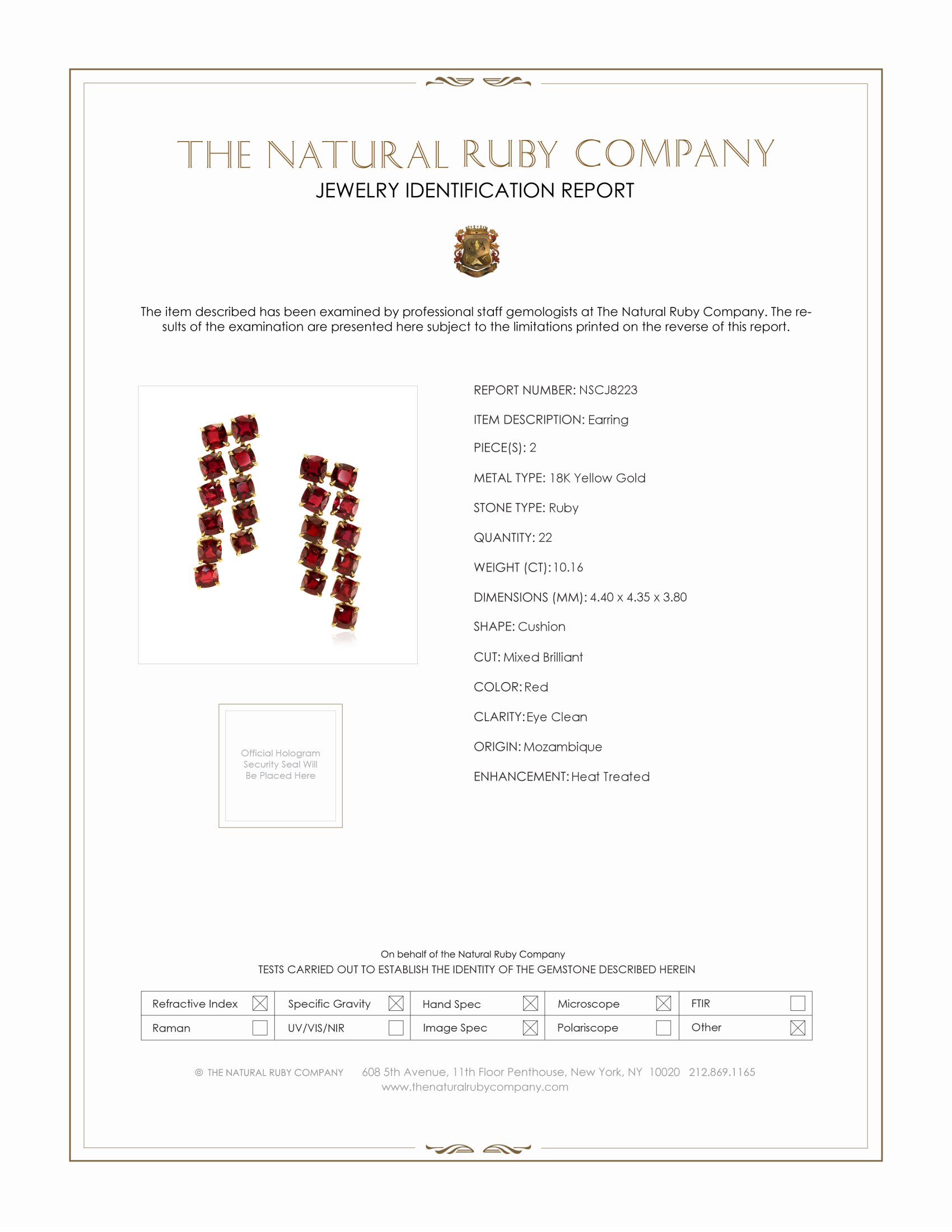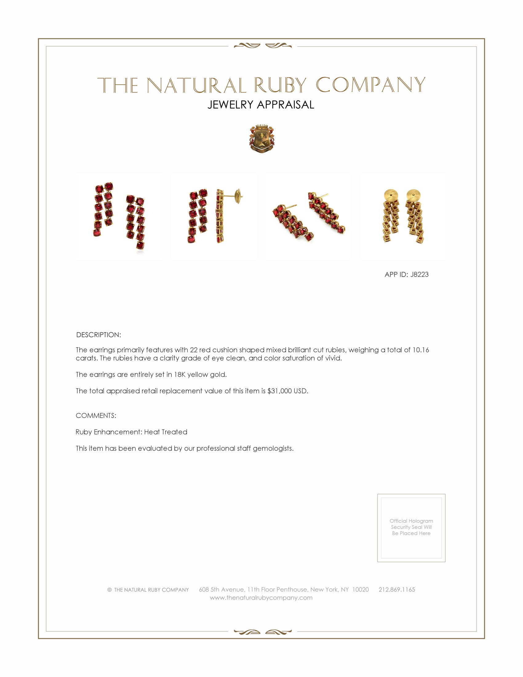 The earrings primarily features with 22 red cushion shaped mixed brilliant cut rubies, weighing a total of 10.16 carats. The rubies have a clarity grade of eye clean, and color saturation of vivid. The earrings are entirely set in 18K yellow gold.