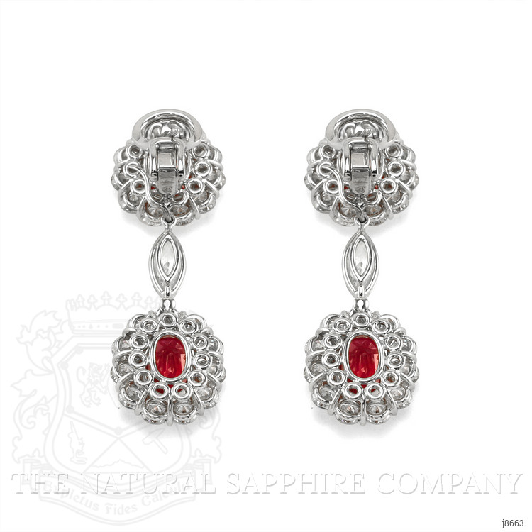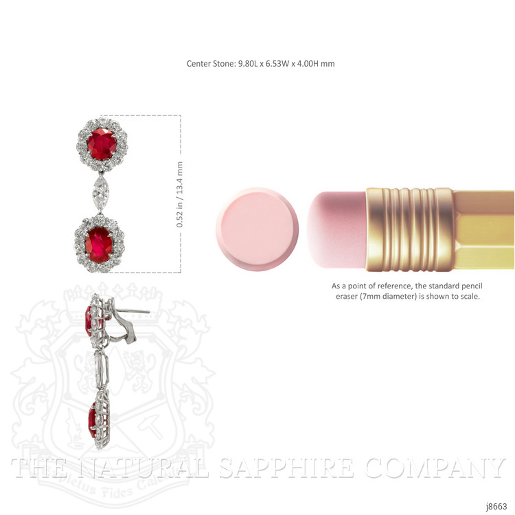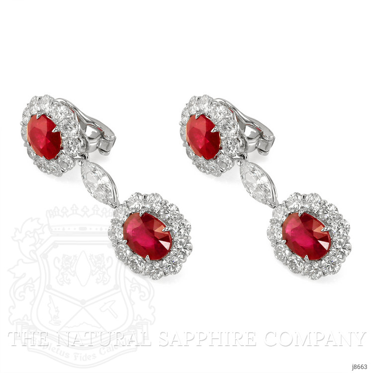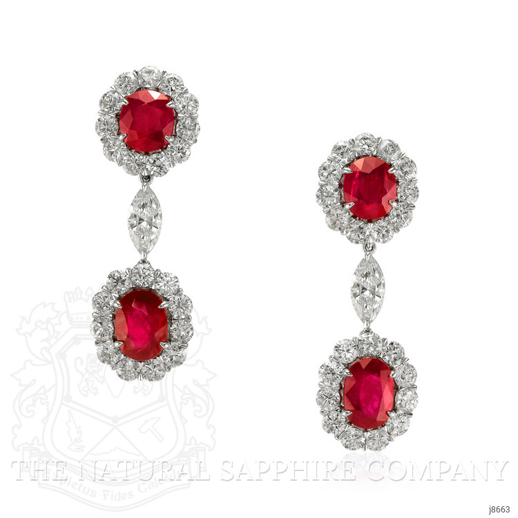 The earrings primarily features with 4 red cushion shaped mixed brilliant cut rubies, weighing a total of 8.77 carats. The rubies have a clarity grade of very slightly included, and color saturation of vivid. Featured in the earrings are 2 white marquise shaped mixed brilliant cut natural diamonds, weighing a total of 1.30 carats. The natural diamonds have a clarity grade of vvs1 - Very Very Slightly Included., F color Also featured in the earrings are 44 white round shaped mixed brilliant cut natural diamonds, weighing a total of 5.49 carats. The natural diamonds have a clarity grade of vvs1 - Very Very Slightly Included., F color The earrings are entirely set in platinum 950.