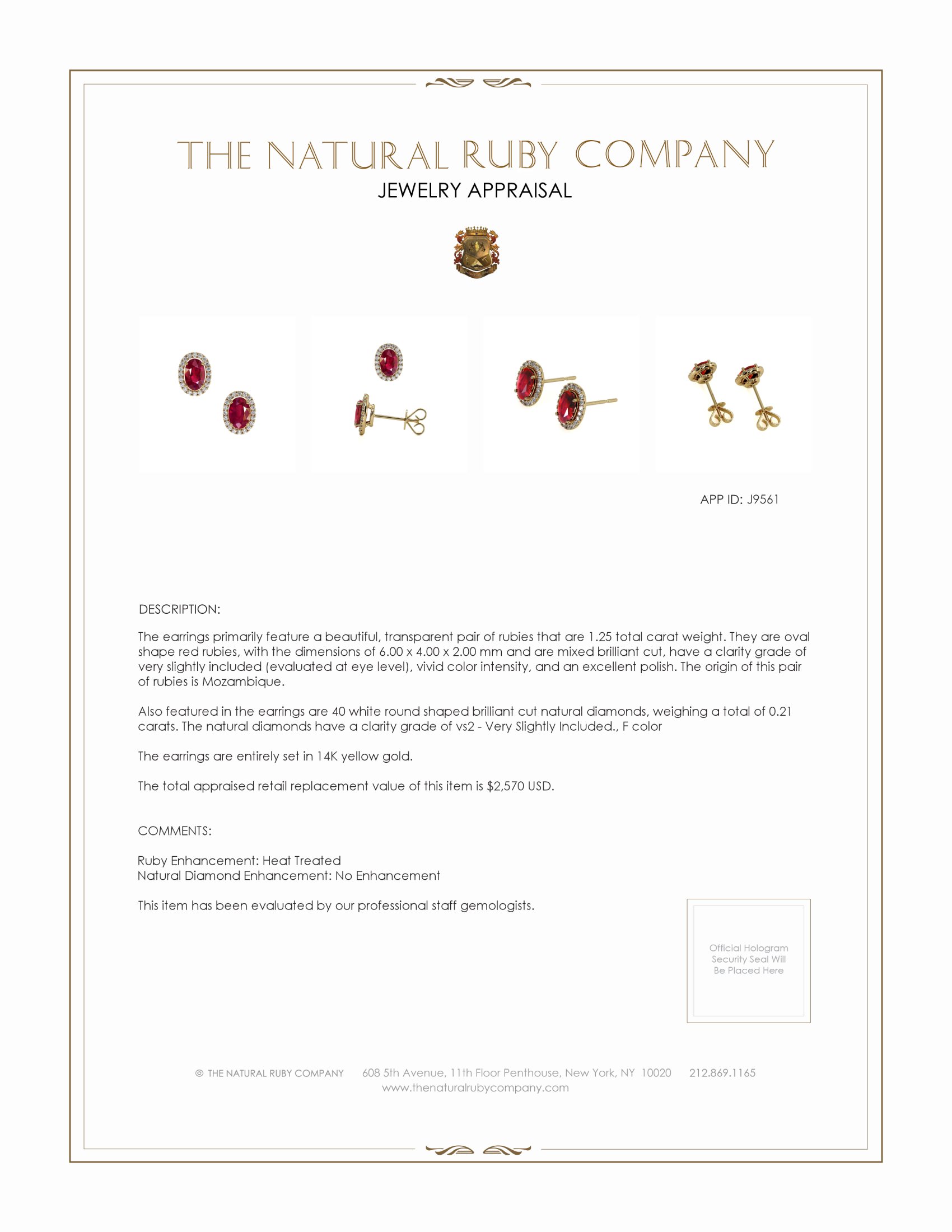 In addition to the Rubies, the earrings feature a selection of 40 white round-shaped brilliant cut Natural Diamonds, weighing a total of 0.21 carats. The F color and vs2 clarity grade of these diamonds signify a standard that is unparalleled, offering an immaculate luster that beautifully complements the rich red of the Rubies. Set entirely in 14K yellow gold, the harmony between the gemstones and the metal produces a timeless aesthetic that effortlessly transcends trends, ensuring that these earrings are not just a fleeting pleasure but a legacy piece to be passed down through the family. Each element of this elegant design reflects the top-tier craftsmanship and attention to detail that The Natural Ruby Company is renowned for in the jewelry industry.