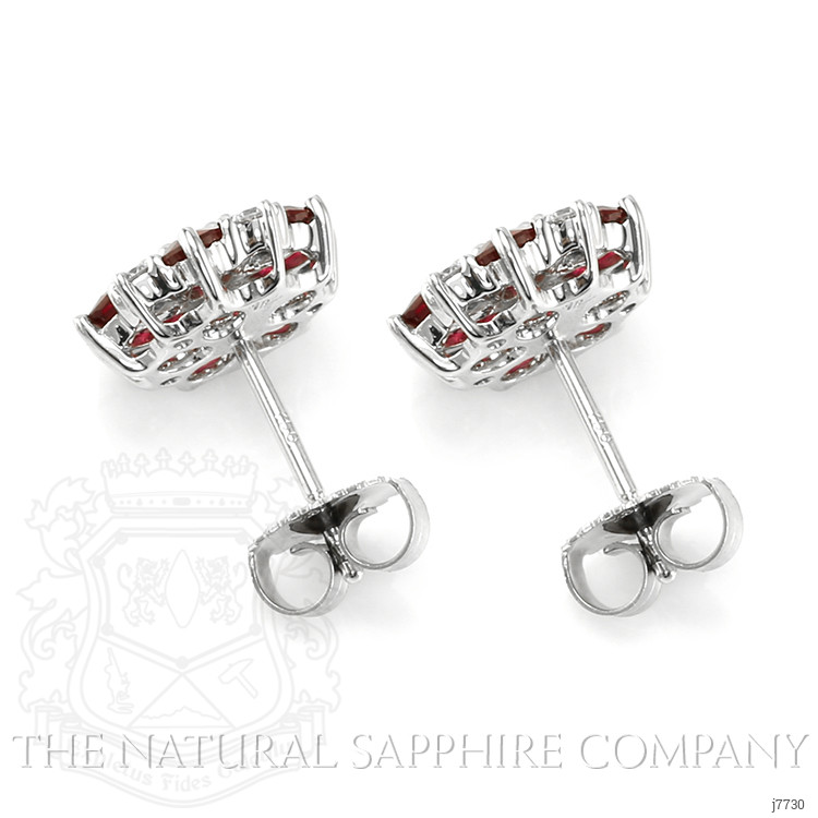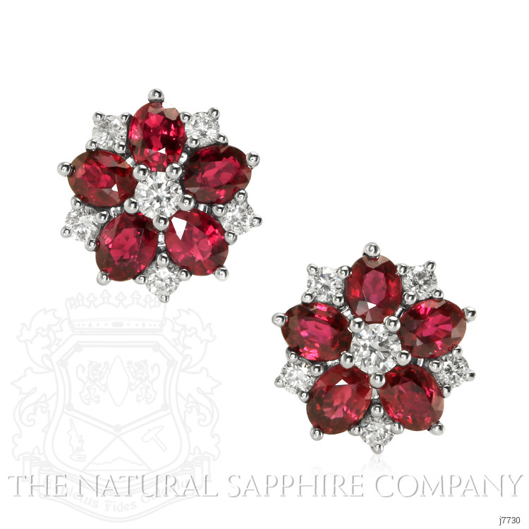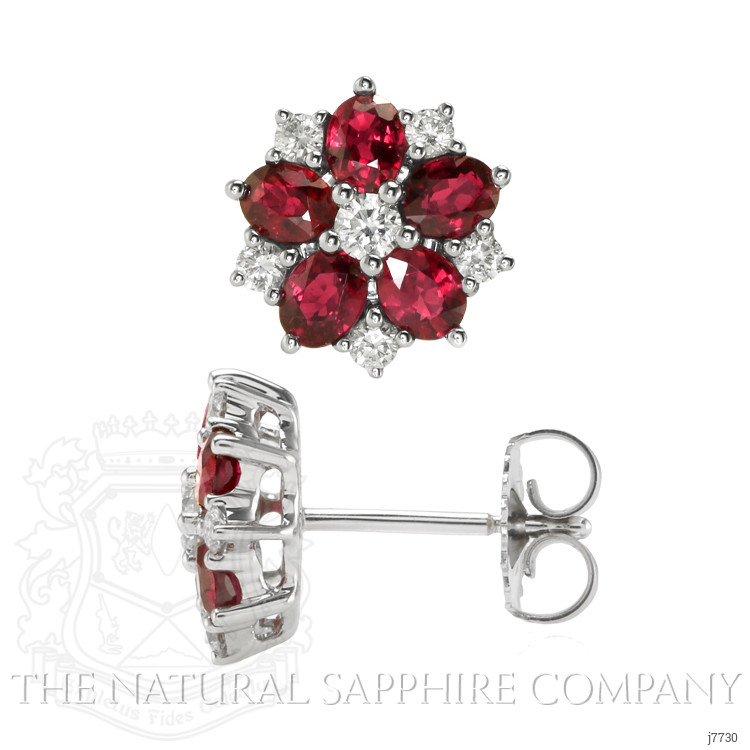 The earrings primarily features with 10 red oval shaped mixed brilliant cut rubies, weighing a total of 2.20 carats. The rubies have a clarity grade of very slightly included, and color saturation of intense. Also featured in the earrings are 12 white round shaped brilliant cut natural diamonds, weighing a total of 0.45 carats. The natural diamonds have a clarity grade of vs1 - Very Slightly Included., F color The earrings are entirely set in 18K white gold.