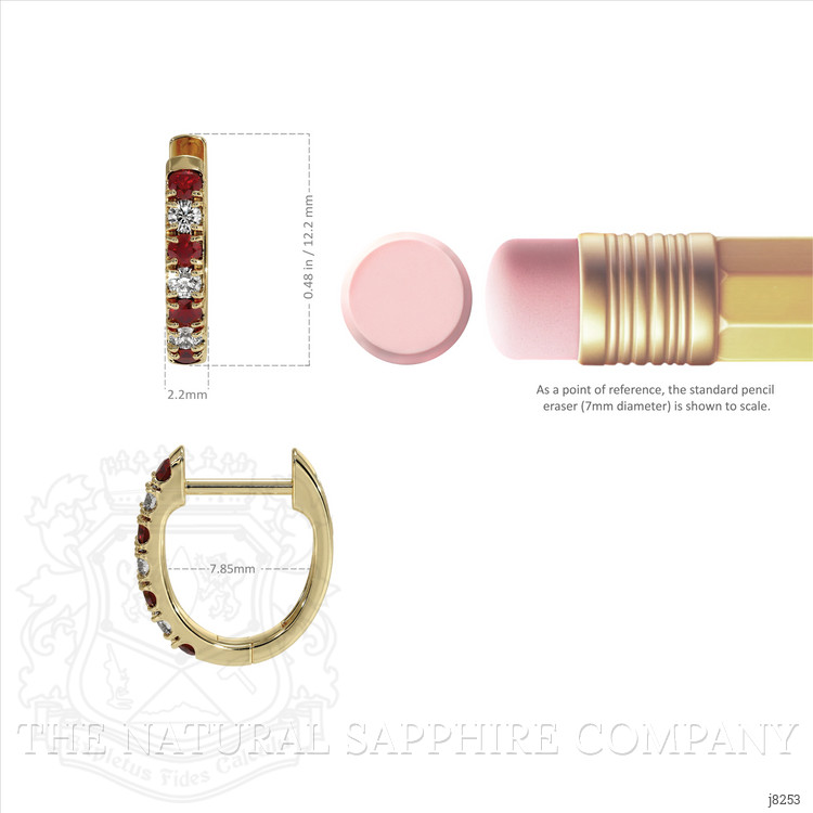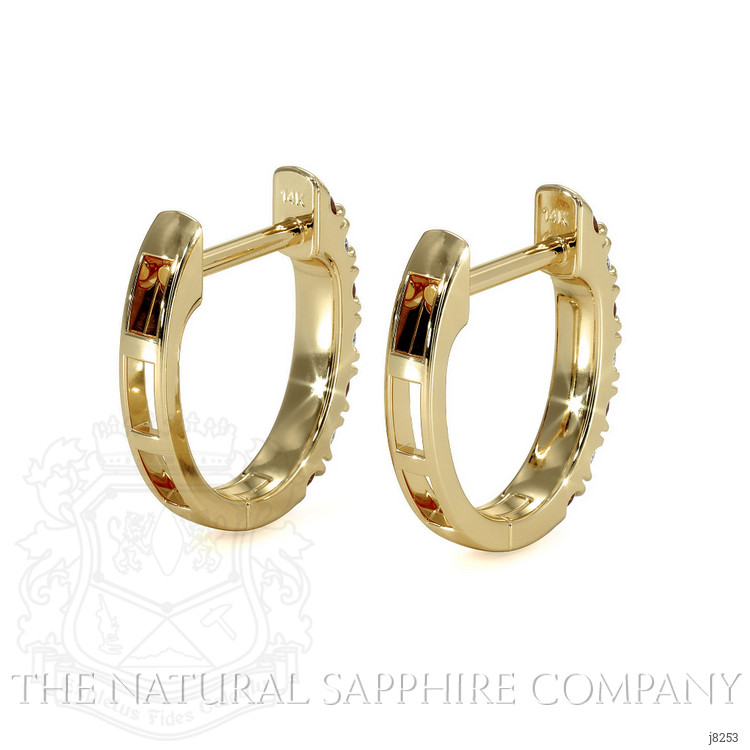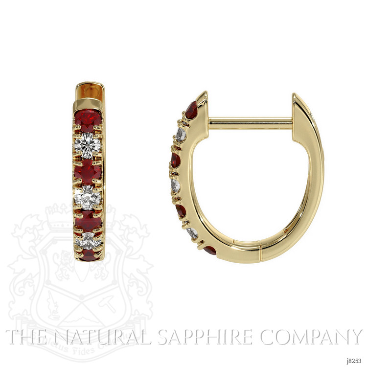 The earrings primarily features with 8 red round shaped brilliant cut rubies, weighing a total of 0.22 carats. The rubies have a clarity grade of eye clean, and color saturation of vivid. Also featured in the earrings are 6 white round shaped brilliant cut natural diamonds, weighing a total of 0.13 carats. The natural diamonds have a clarity grade of vs2 - Very Slightly Included., F color The earrings are entirely set in 14K yellow gold.
