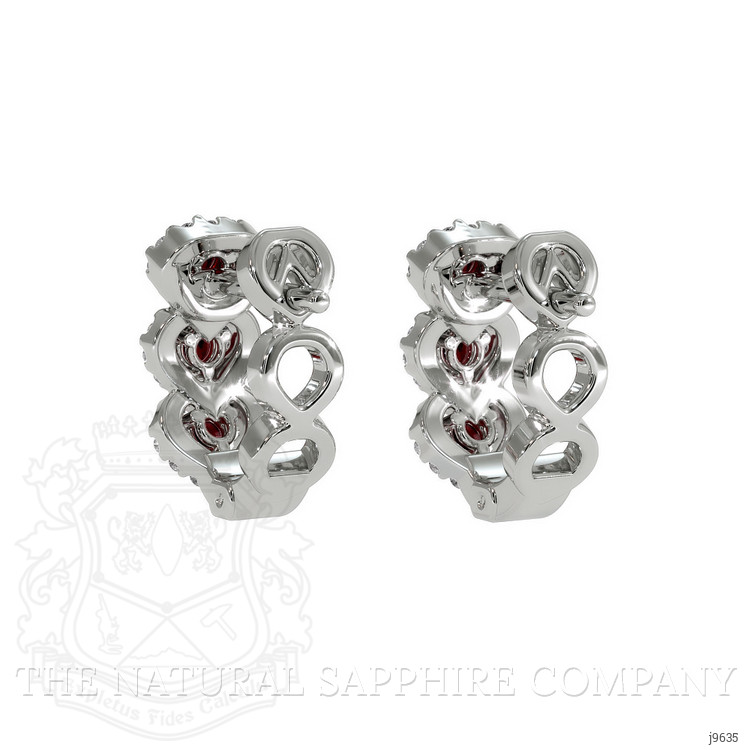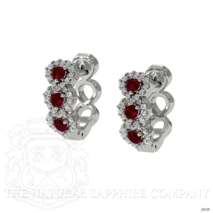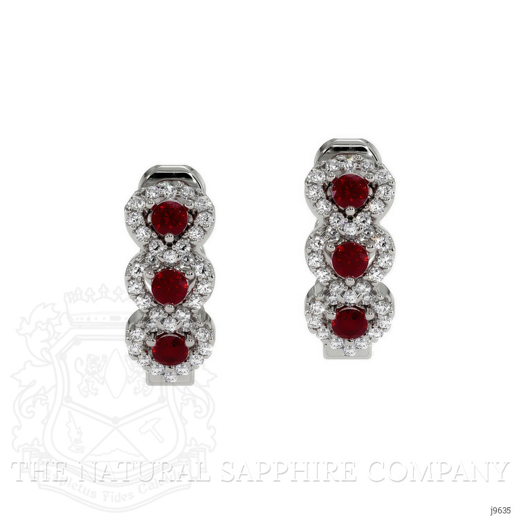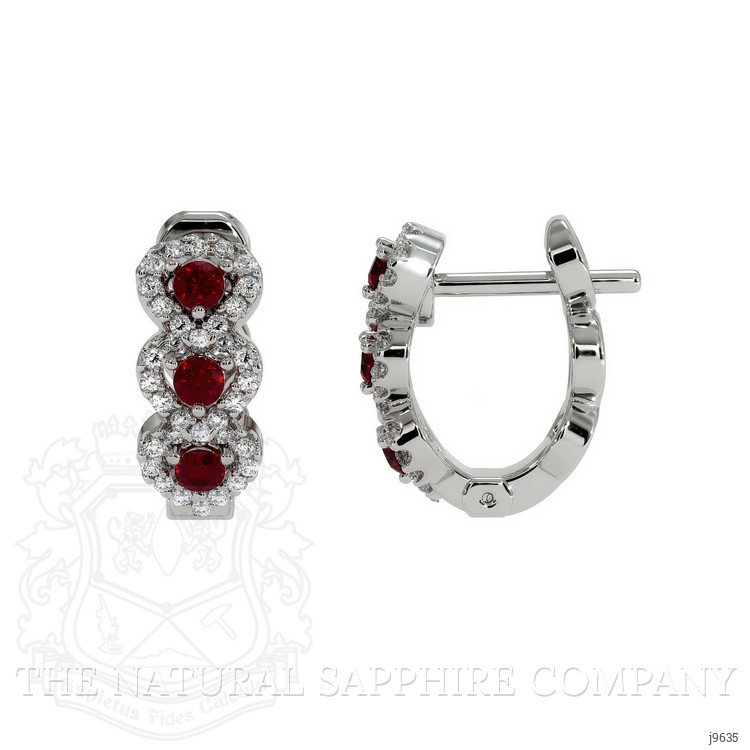 The earrings primarily features with 6 red round shaped brilliant cut rubies, weighing a total of 0.35 carats. The rubies have a clarity grade of eye clean, and color saturation of vivid. Also featured in the earrings are 68 white round shaped brilliant cut natural diamonds, weighing a total of 0.22 carats. The natural diamonds have a clarity grade of vs2 - Very Slightly Included., F color The earrings are entirely set in 18K white gold.