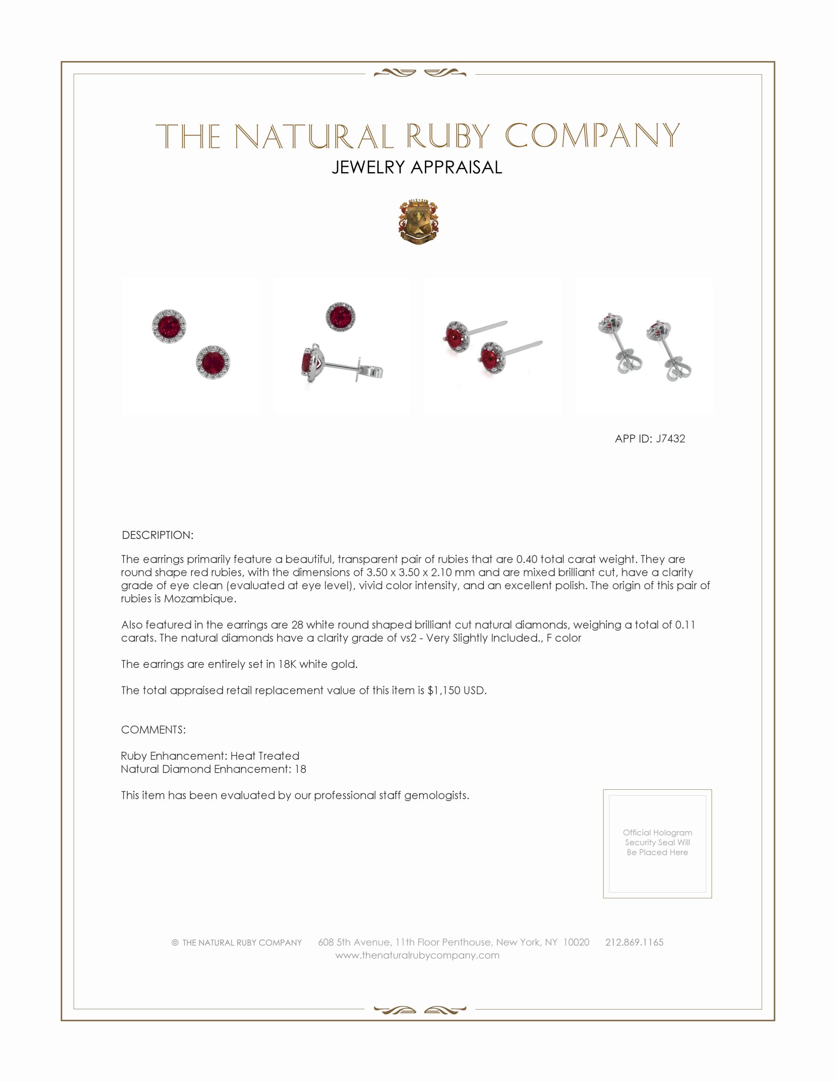 Indulge yourself in the exquisite allure of The Natural Ruby Company's meticulously crafted earrings, where luxury meets unparalleled elegance. Beyond mere adornments, these earrings are a testament to the privileged art of selecting masterpieces woven from nature's most coveted treasures. The centerpiece of this opulent creation is a pair of magnificent transparent rubies, carefully curated for those with a penchant for the extraordinary. Each gemstone boasts an impressive total carat weight of 0.40 carats, where nature's brilliance unfurls in the round cut, revealing perfection in its symmetry and divine proportions.