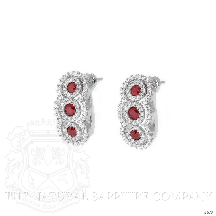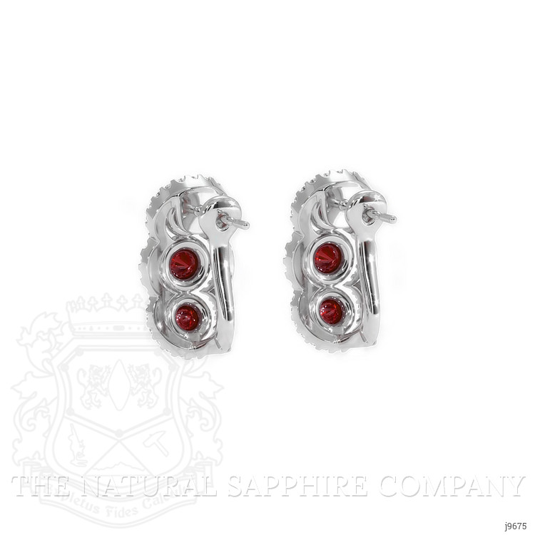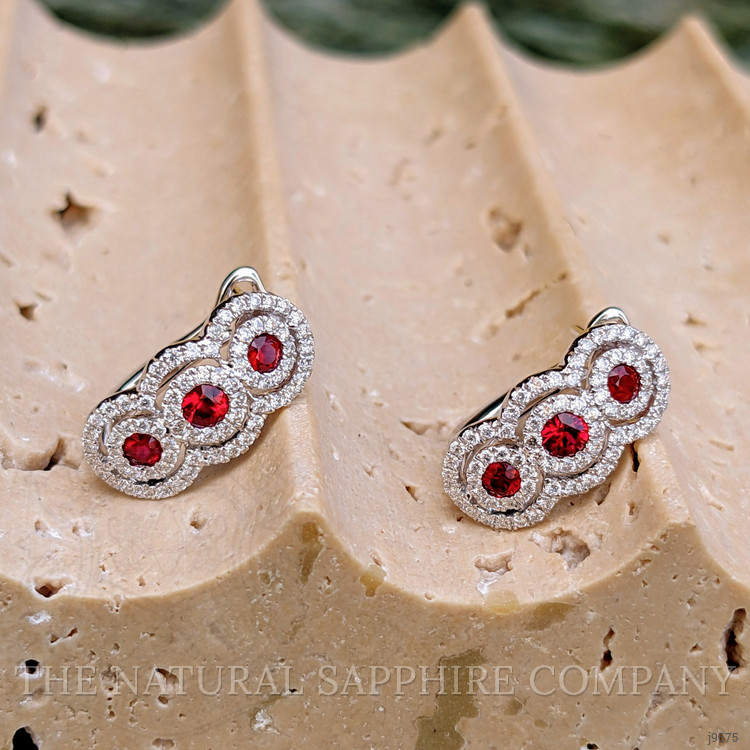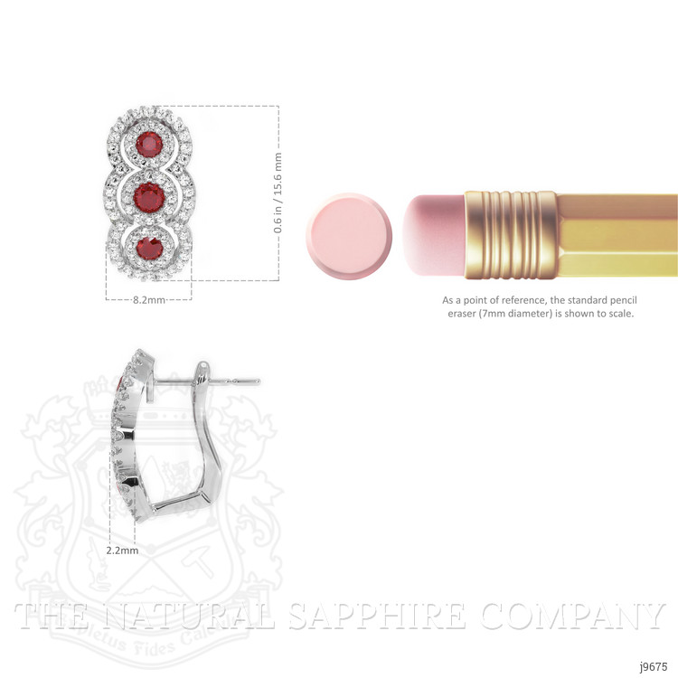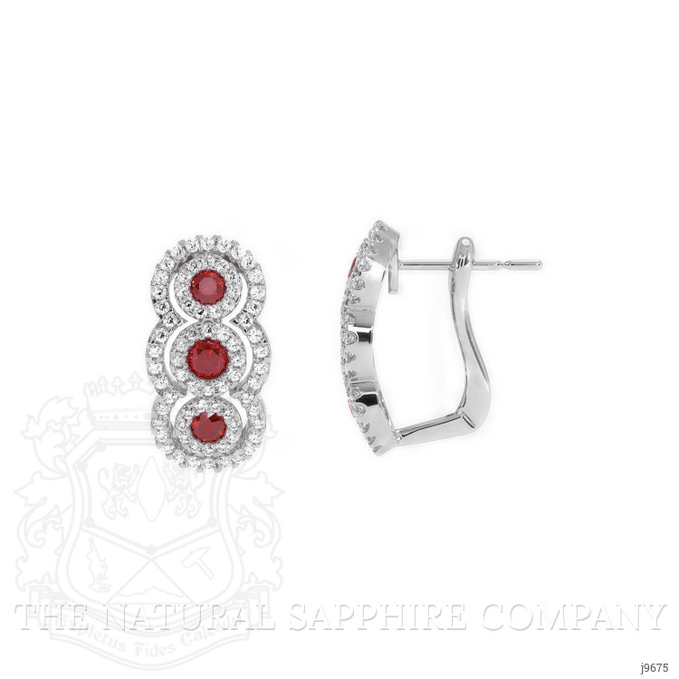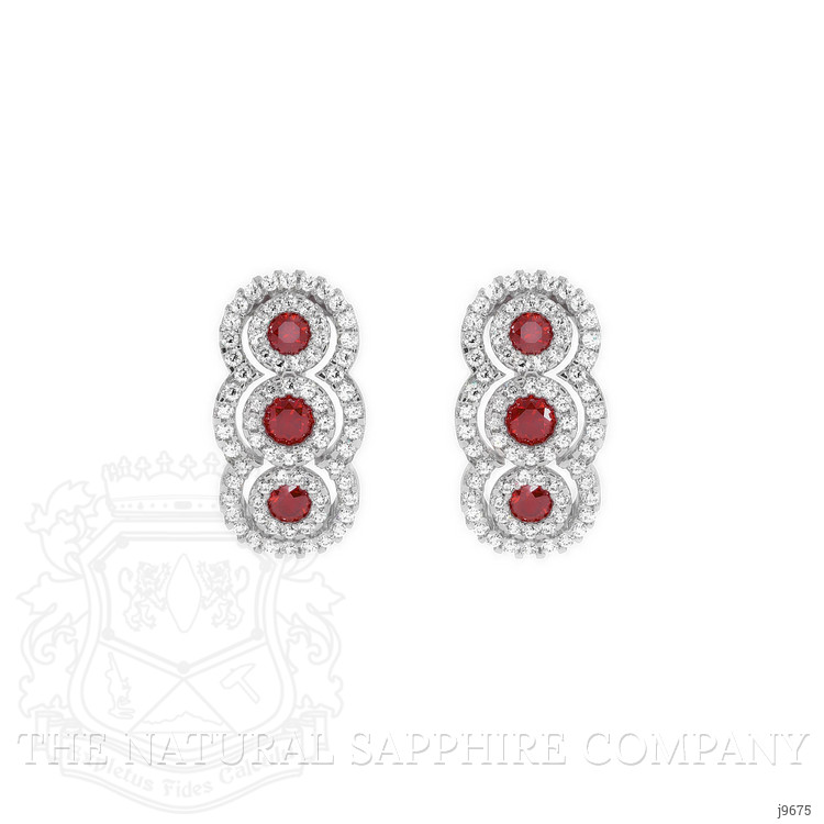 The earrings primarily feature a beautiful, transparent pair of rubies that are 0.46 total carat weight. They are round shape red rubies, with the dimensions of 2.60 x 2.60 x 1.18 mm and are brilliant cut, have a clarity grade of eye clean (evaluated at eye level), vivid color intensity, and an excellent polish. The origin of this pair of rubies is Mozambique. Featured in the earrings are 4 red round shaped brilliant cut rubies, weighing a total of 0.40 carats. The rubies have a clarity grade of eye clean, and color saturation of vivid. Also featured in the earrings are 144 white round shaped mixed brilliant cut natural diamonds, weighing a total of 0.42 carats. The natural diamonds have a clarity grade of vs1 - Very Slightly Included., F color The earrings are entirely set in 18K white gold.