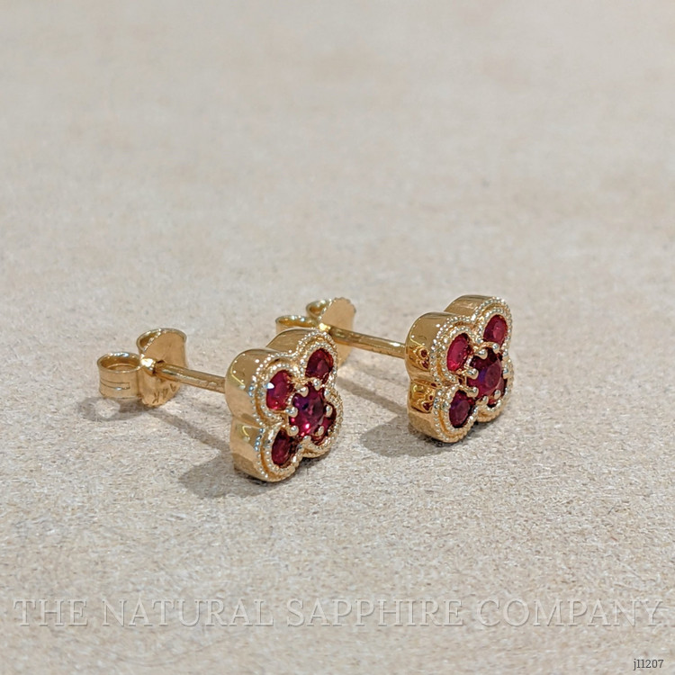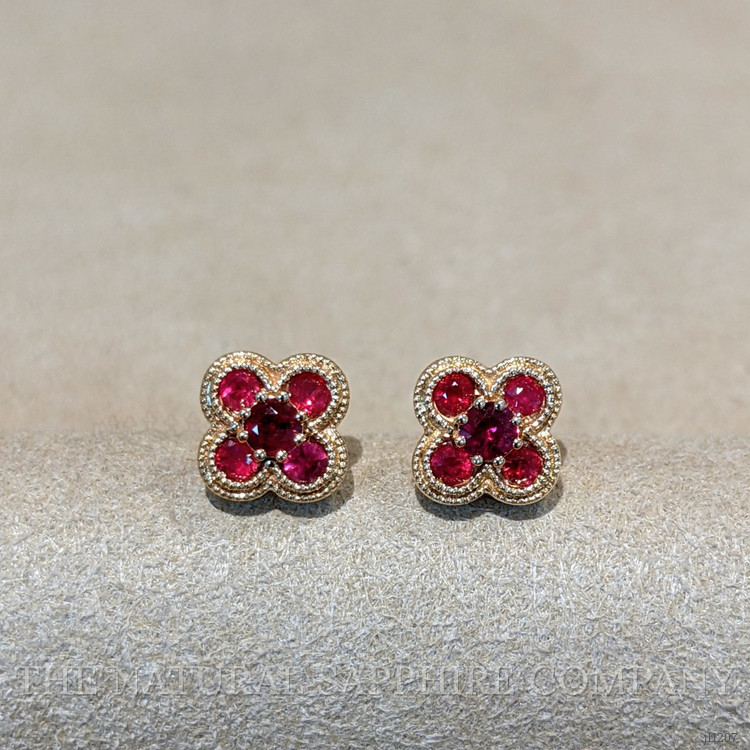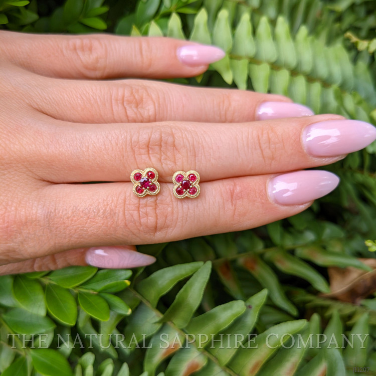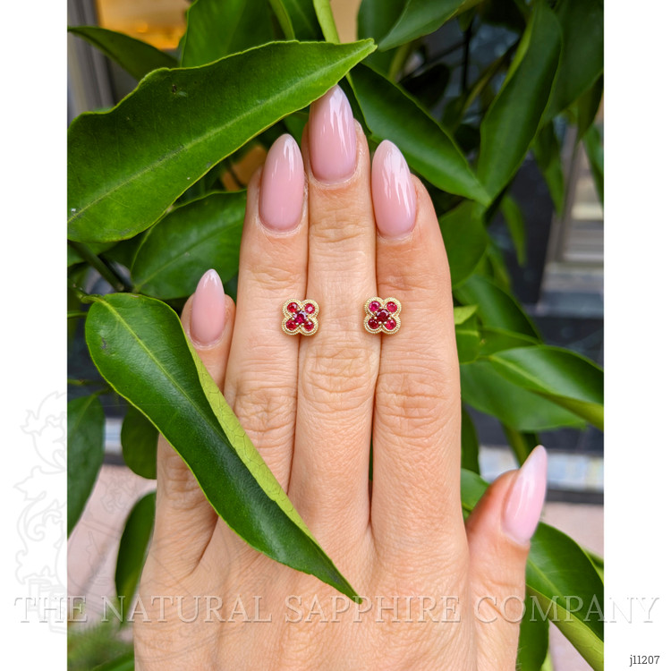 These earrings are crafted entirely in 14K yellow gold, and that material choice alone separates them from the majority of pieces on the market that rely on plating or lower karat alloys. Where gold plated studs fade and reveal base metals after months, these solid 14K earrings maintain color depth and resist daily wear, providing long term value that outperforms trend pieces. The petite quatrefoil profile with four vibrant red stones set with precise spacing gives a refined silhouette that reads more luxurious than simple single stone studs at a similar price point. Compared to mass produced alternatives, the attention to milgrain edging and the balanced stone layout creates a texture and dimension that catches light without appearing ostentatious, so these look equally polished in a professional setting as they do with evening attire. Because the entire setting is 14K yellow gold, these earrings are less likely to irritate sensitive ears than plated costume jewelry, and they hold resale and heirloom potential that lower quality options cannot match.
