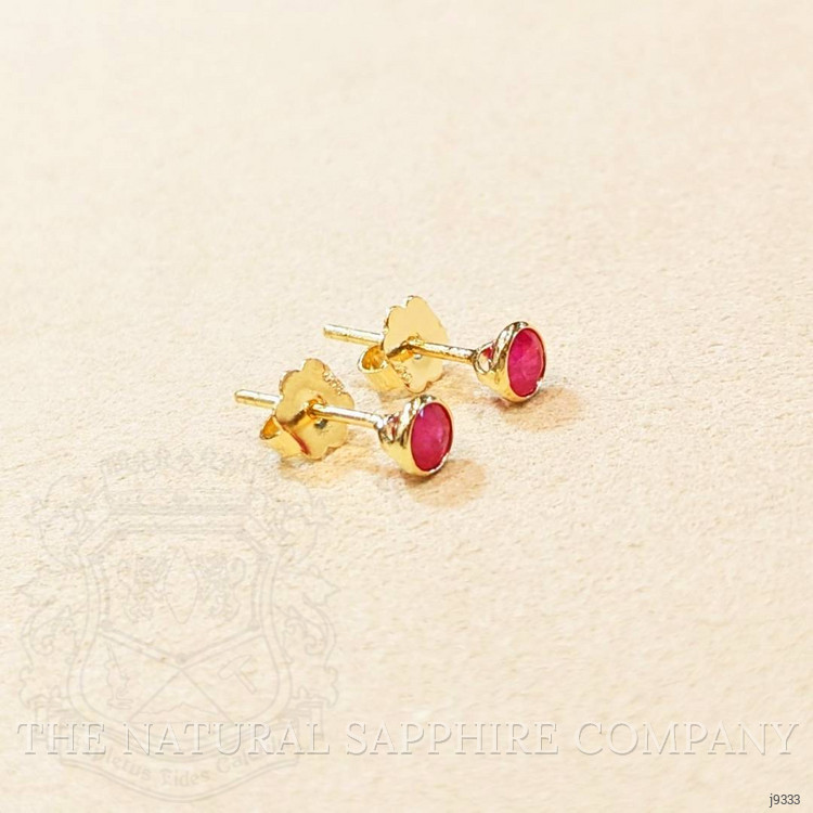 The earrings primarily feature a beautiful, transparent pair of rubies that are 0.57 total carat weight. They are round shape red rubies, with the dimensions of 3.70 x 3.70 x 2.20 mm and are mixed brilliant cut, have a clarity grade of slightly included (evaluated at eye level), vivid color intensity, and an excellent polish. The origin of this pair of rubies is Thailand. The earrings are entirely set in 18K yellow gold.