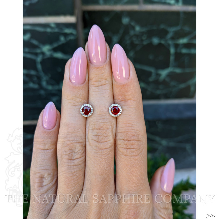 From the warm heart of Mozambique, nestled among the verdant landscapes and sunlit arches of the earth, emerges a gem whose journey is as radiant as its impact. These earrings, epitomizing elegance, showcase rare Mozambican rubies celebrated for their vivid, entrancing red hues. This pair of rubies, meticulously crafted to a total weight of 0.95 carats, carries with them the spirit and history of their origins. They are shaped into perfect rounds, each measuring precisely 4.50 mm with a depth of 2.85 mm, made luminous by a mixed brilliant cut that magnifies their allure. The rubies possess a clarity so pure that they captivate with every glance, a testament to their eye-clean grading. Enhanced by gentle heat treatments, their color intensity remains vivid, backed by a polish that achieves sheer perfection.