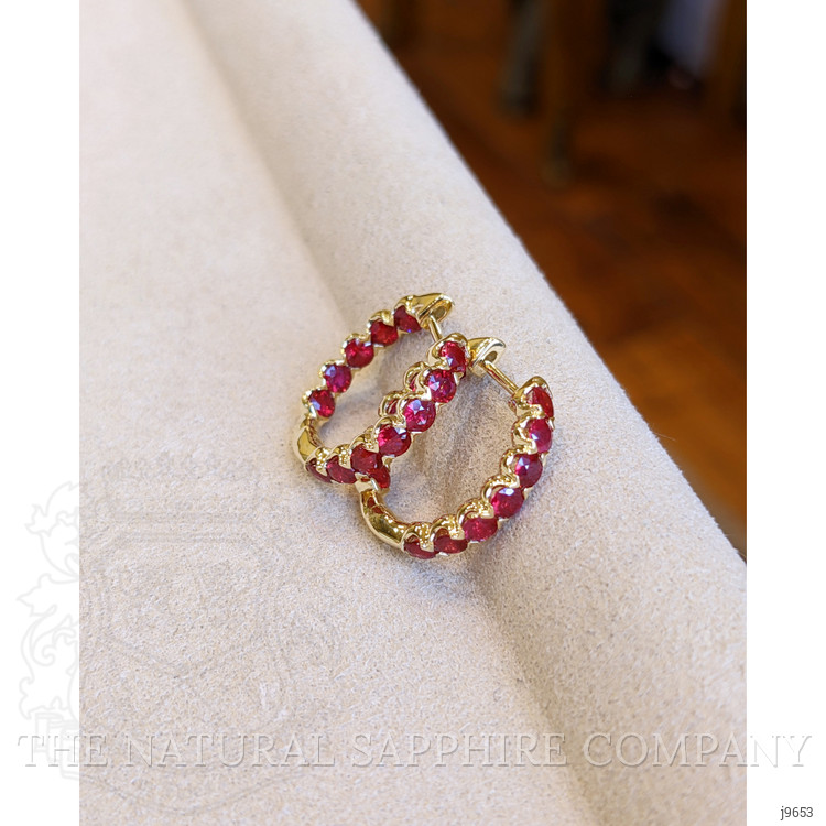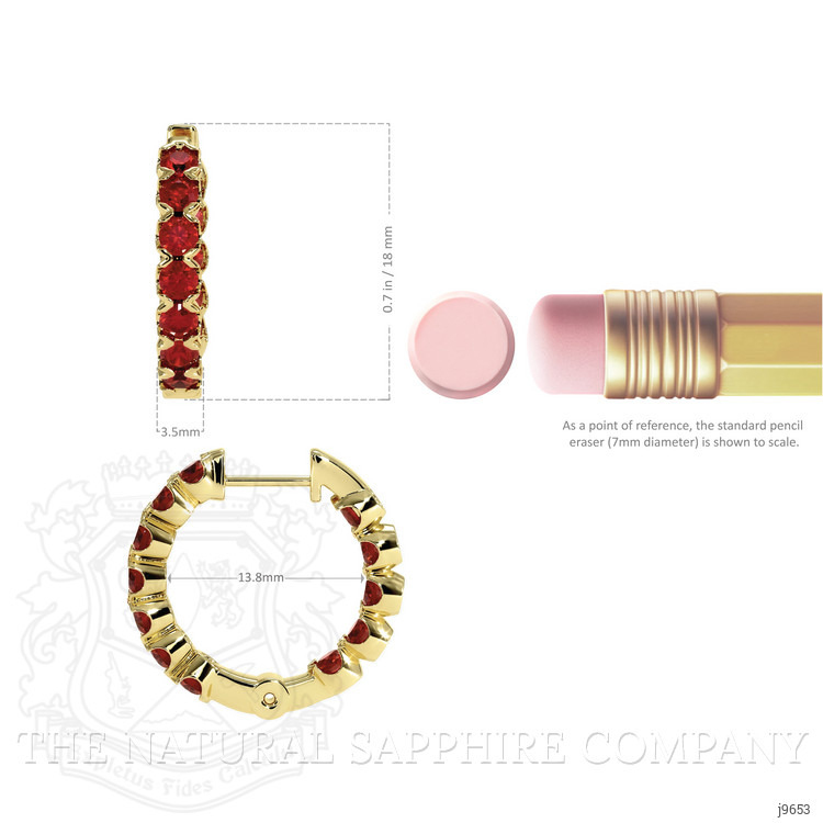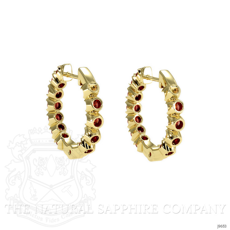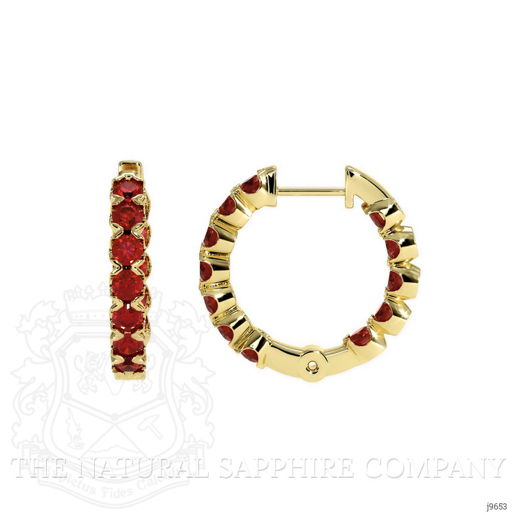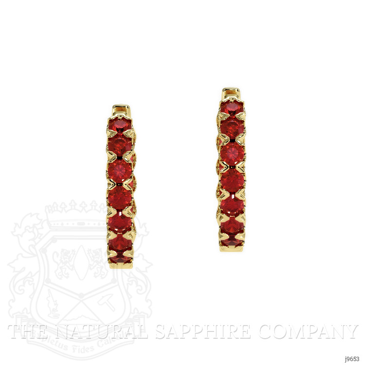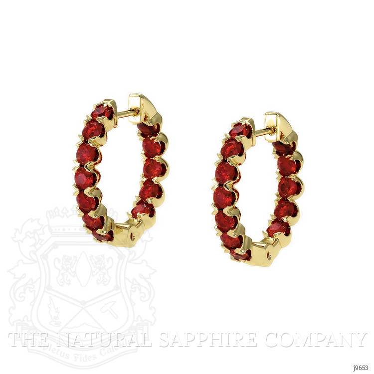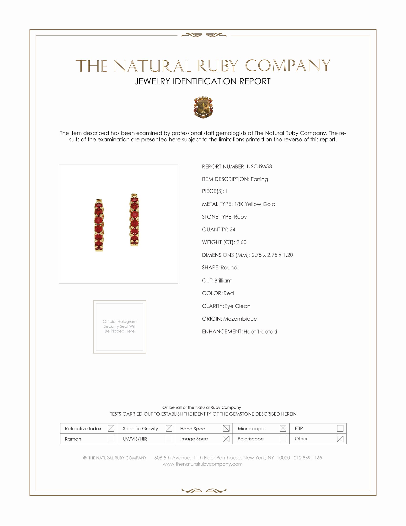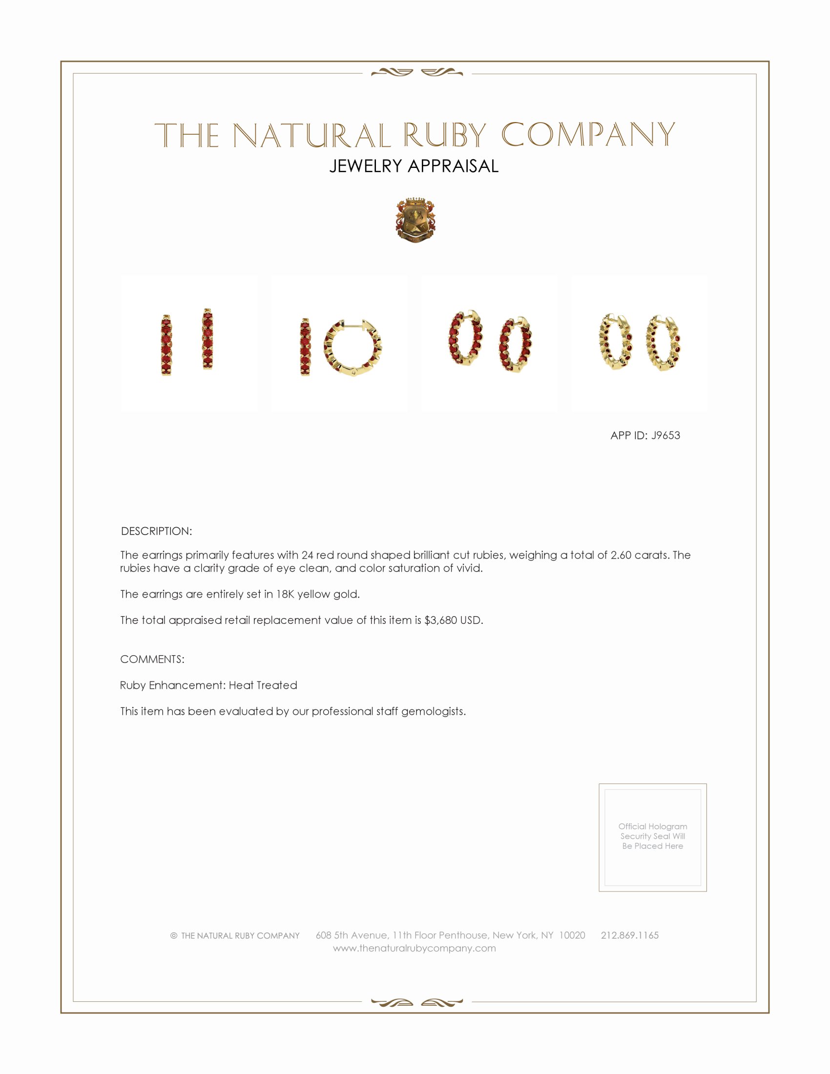 The earrings primarily features with 24 red round shaped brilliant cut rubies, weighing a total of 2.60 carats. The rubies have a clarity grade of eye clean, and color saturation of vivid. The earrings are entirely set in 18K yellow gold.