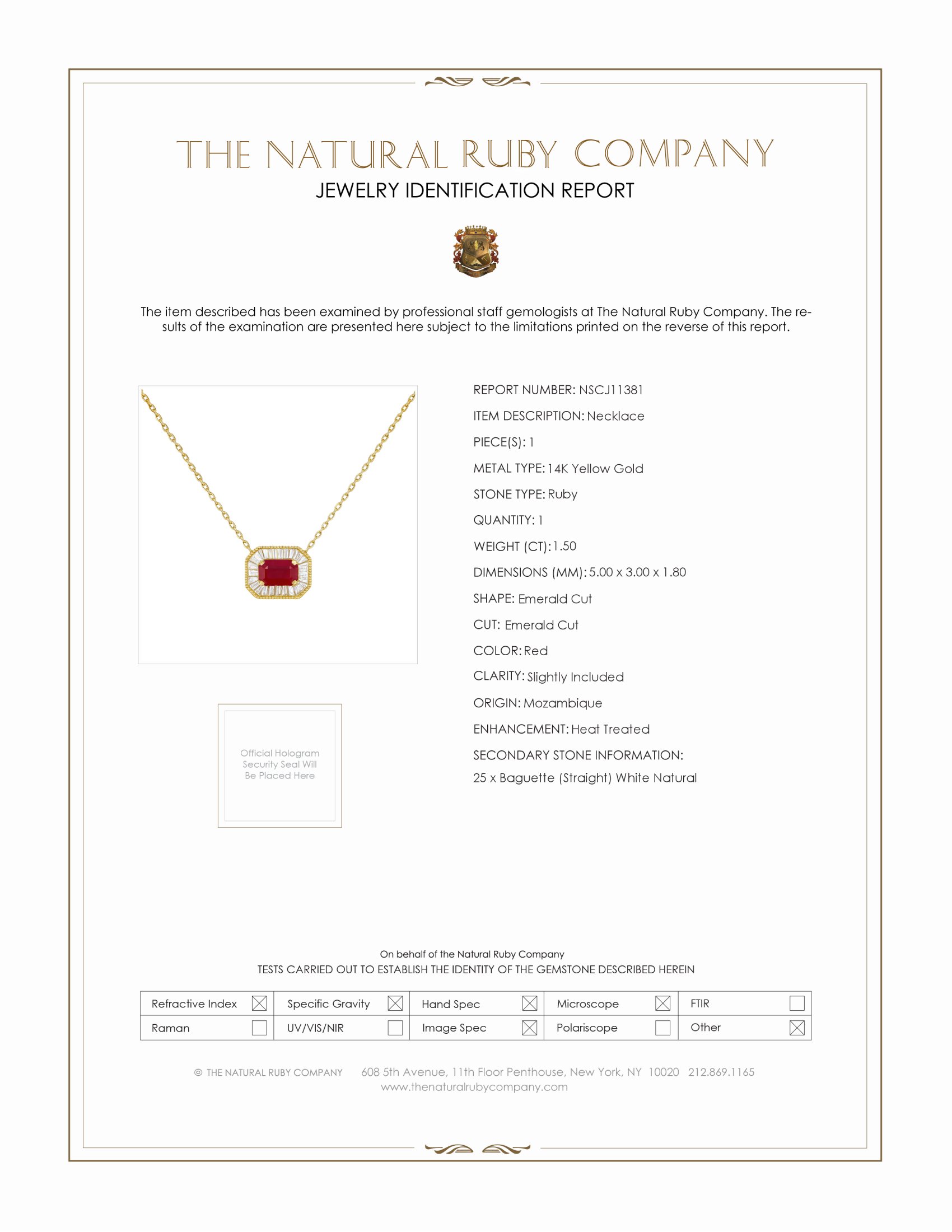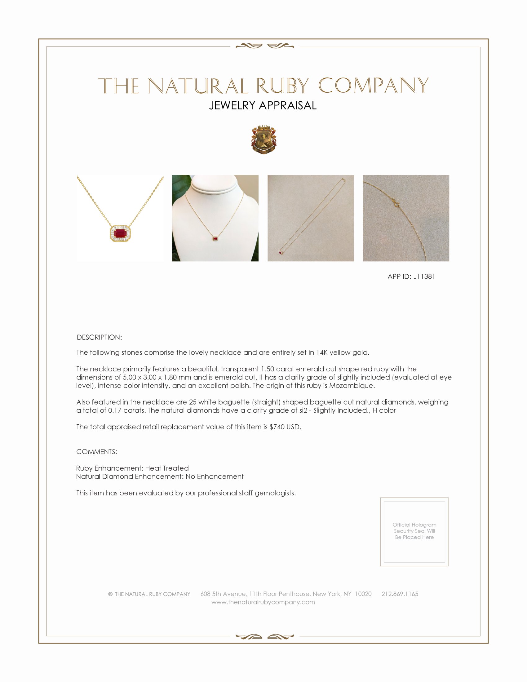 This exquisite necklace is a hallmark of elegance and sophistication, crafted to be an enduring piece in any jewelry collection. At its heart lies a captivating ruby, known for its rich, deep red hue, symbolizing passion and vitality. Surrounding the central stone are meticulously arranged baguette-cut diamonds, each precisely placed to enhance the ruby’s natural brilliance. The gemstones are elegantly set in luxurious 14K yellow gold, providing a warm and classic backdrop that enhances their vivid colors. The design is thoughtfully conceived to balance opulence with simplicity, ensuring that it can be worn for both everyday elegance and special occasions.