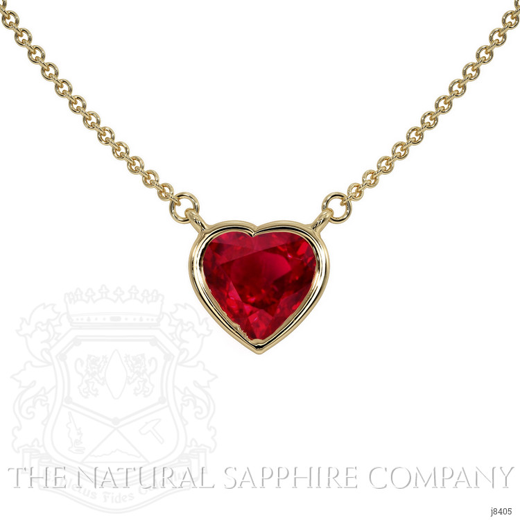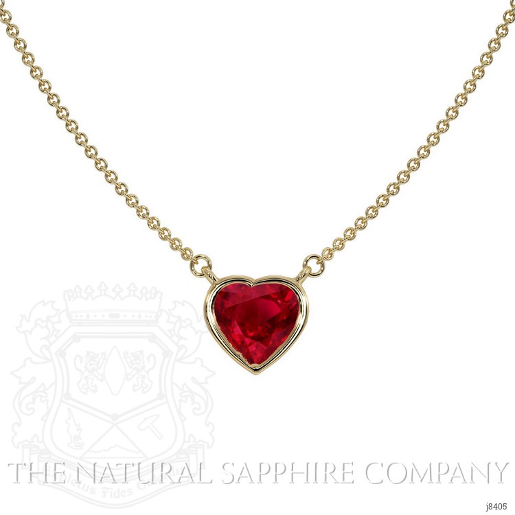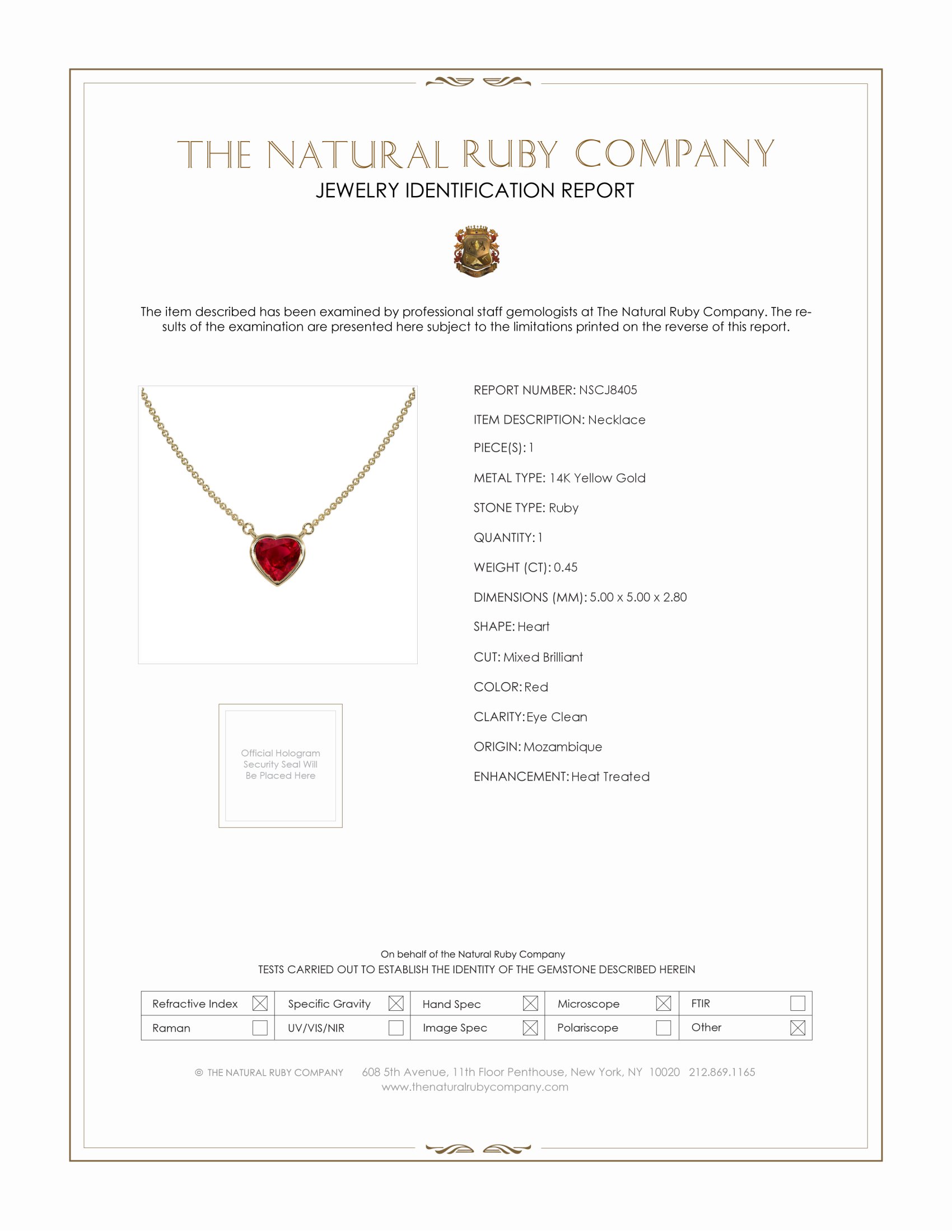 At the heart of this necklace lies its centerpiece—a mesmerizing 0.45-carat heart-shaped red Ruby born from the rich soils of Mozambique. This Ruby, enhanced by the skilled art of heat treatment, is a testament to unparalleled beauty with its vivid color intensity and excellent polish. Its eye-clean clarity, evaluated at eye level, ensures a gemstone of striking brilliance, capturing the light in every angle with a passionate glow. The dimensions of 5.00 x 5.00 x 2.80 mm speak to its perfect proportions, a perfect blend of bold presence with delicate charm. Set in exquisite 14K yellow gold, each heartbeat of this necklace encapsulates the essence of pure enchantment, a vivid masterpiece of nature intertwined with human creativity.