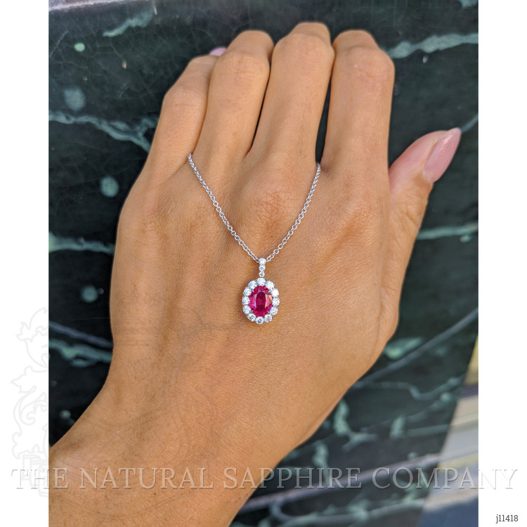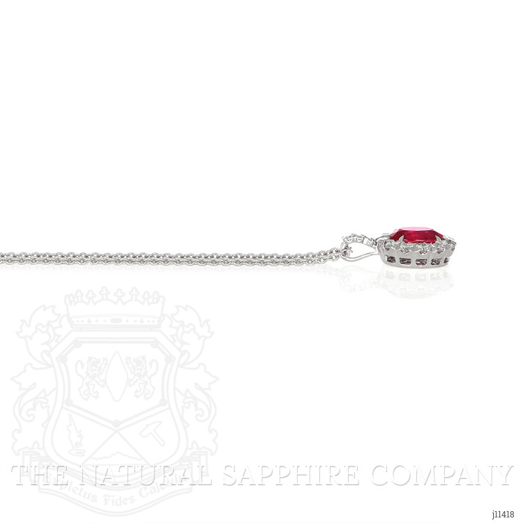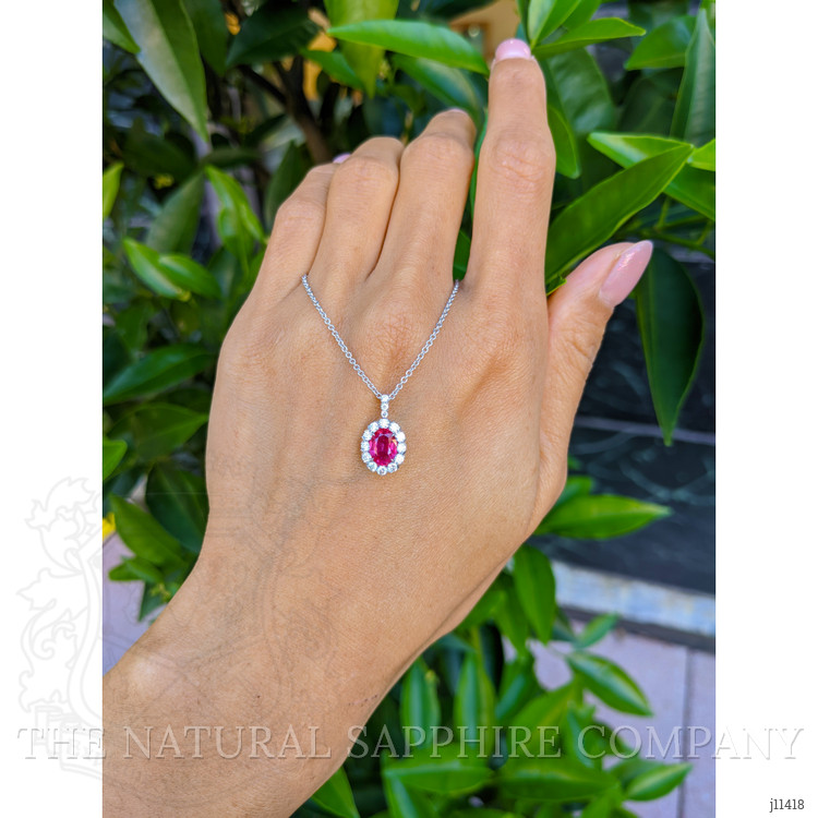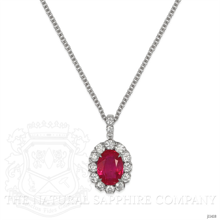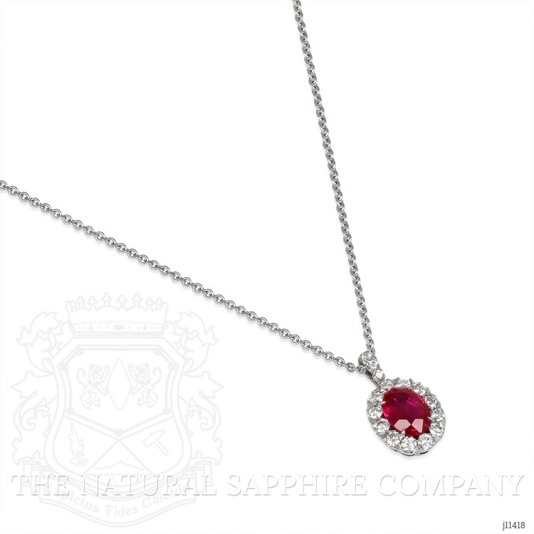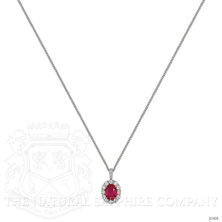 Wreathed in the elegance of 18K white gold, this exquisite pendant melds classic craftsmanship with the timeless beauty of its gemstones. At its heart lies a vibrant ruby, renowned for its vivid red hue, which captures the eye and spirit. The ruby features an oval cut, expertly faceted to maximize its brilliance and fire. With every facet precisely polished, the ruby reflects light in a manner that gloriously showcases its intensity and depth of color, distinguishing it as a premium Grade AA gemstone. Surrounding the ruby are meticulously selected diamonds, each boasting a color grade of F and clarity of VS2, ensuring they are nearly colorless and virtually free from inclusions. Their brilliant round cuts are chosen to complement the central gemstone, each one contributing to a halo of brilliance that frames the ruby with a spectacular play of light.