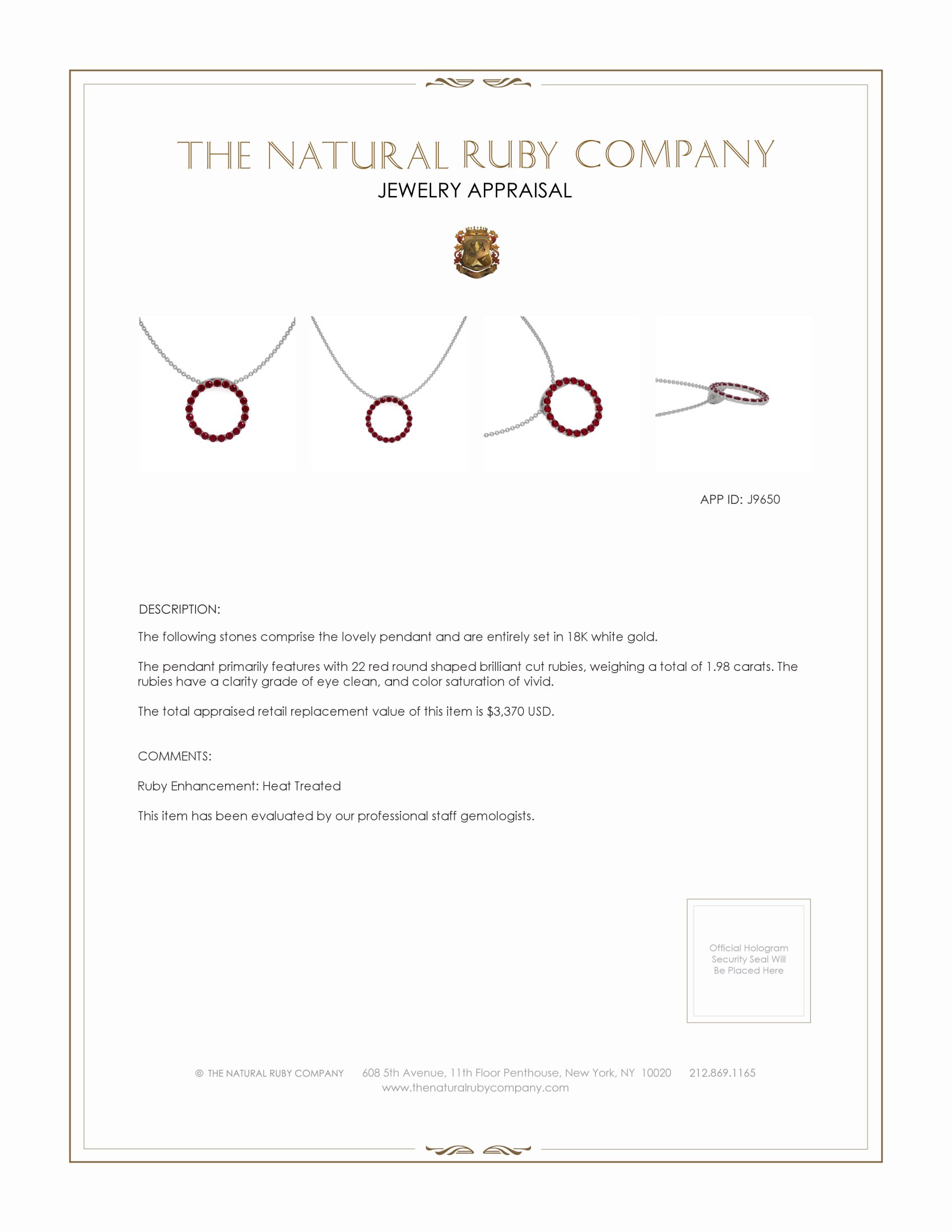 The following stones comprise the lovely pendant and are entirely set in 18K white gold. The pendant primarily features with 22 red round shaped brilliant cut rubies, weighing a total of 1.98 carats. The rubies have a clarity grade of eye clean, and color saturation of vivid.