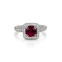 The ring primarily features a beautiful, transparent 1.28 carat cushion shape red ruby with the dimensions of 7.55 x 7.52 x 4.92 mm and is mixed brilliant cut. It has a clarity grade of eye clean (evaluated at eye level), vivid color intensity, and an excellent polish. The origin of this ruby is Mozambique. Also featured in the ring are 178 white round shaped brilliant cut natural diamonds, weighing a total of 0.97 carats. The natural diamonds have a clarity grade of vvs1 - Very Very Slightly Included., F color The ring is entirely set in 18K white gold.