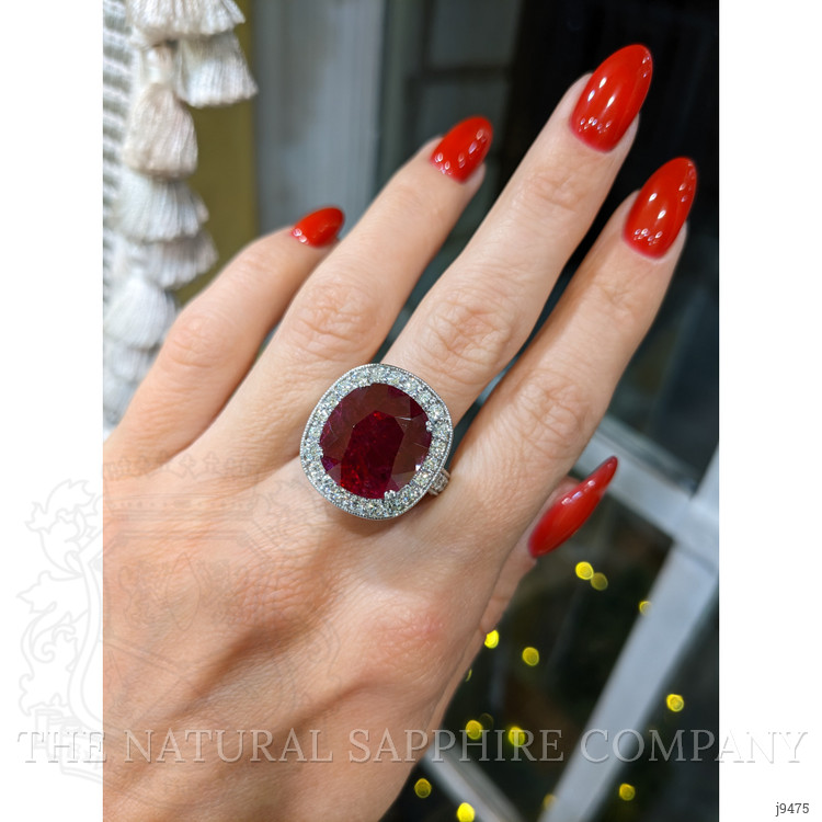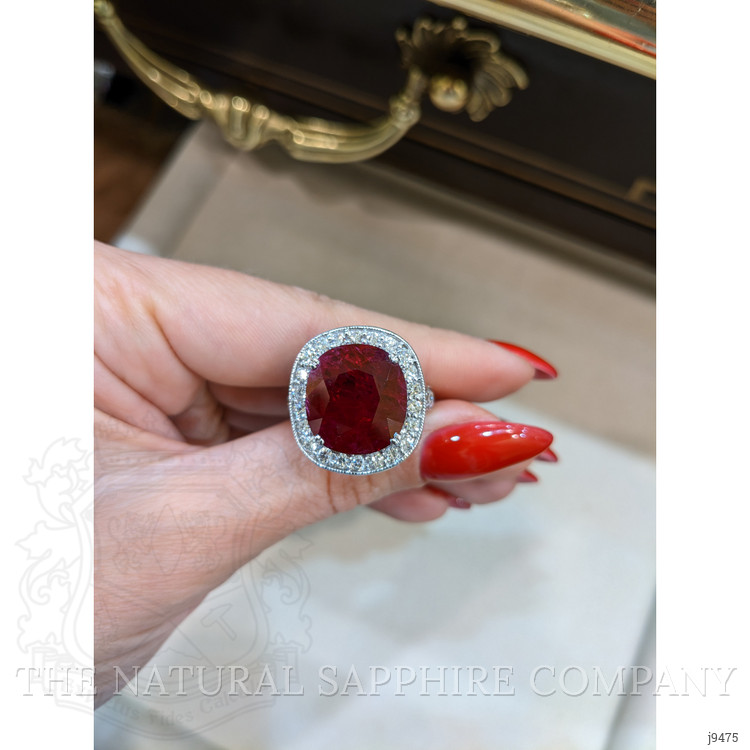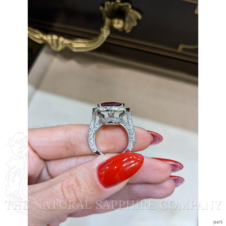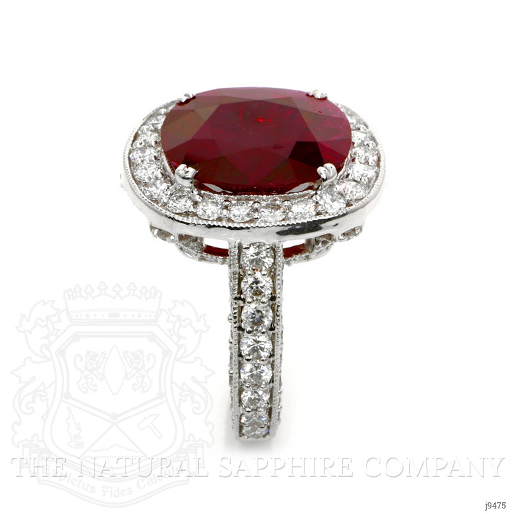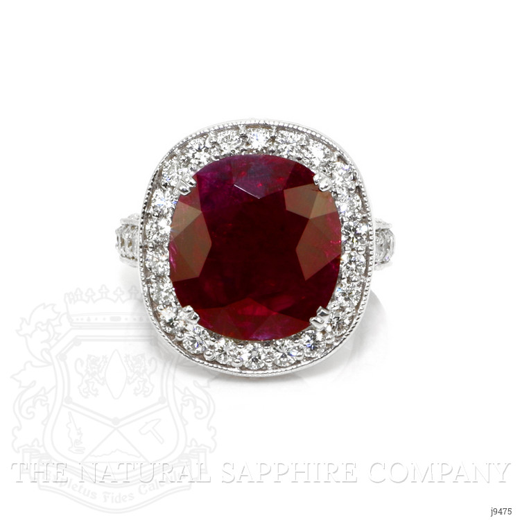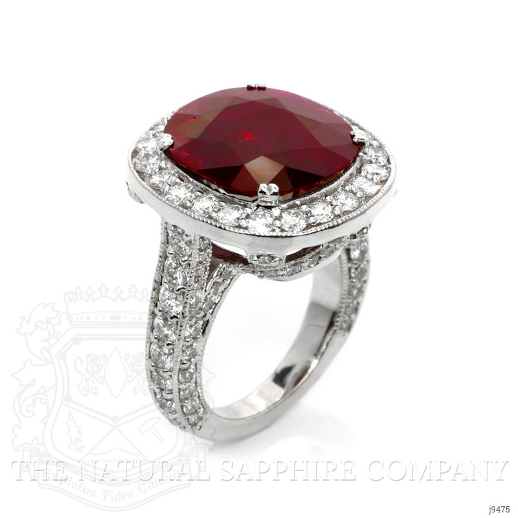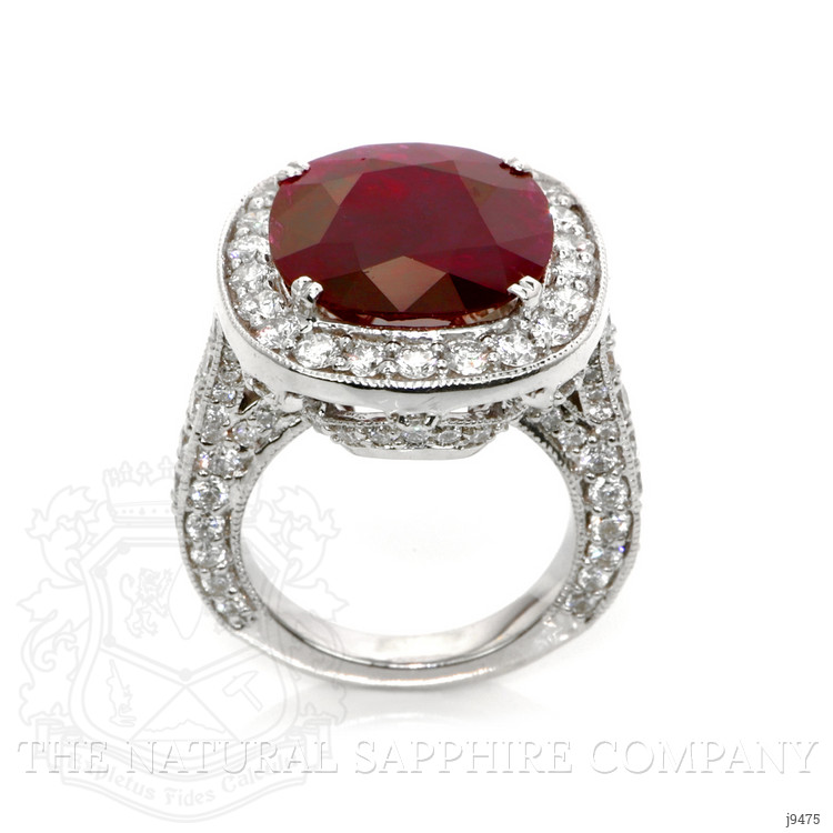 The ring primarily features a beautiful, transparent 10.09 carat cushion shape red ruby with the dimensions of 15.03 x 13.88 x 5.93 mm and is mixed brilliant cut. It has a clarity grade of very slightly included (evaluated at eye level), vivid color intensity, and an excellent polish. The origin of this ruby is Mozambique. Also featured in the ring are 132 white round shaped mixed brilliant cut natural diamonds, weighing a total of 3.02 carats. The natural diamonds have a clarity grade of vs1 - Very Slightly Included., F color The ring is entirely set in 18K white gold.