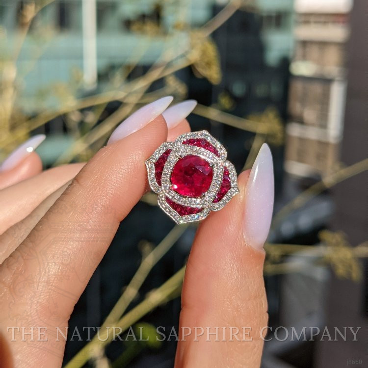 The ring primarily features a beautiful, transparent 2.26 carat cushion shape red ruby with the dimensions of 7.53 x 7.30 x 4.17 mm and is mixed brilliant cut. It has a clarity grade of slightly included (evaluated at eye level), vivid color intensity, and an excellent polish. The origin of this ruby is unknown. Featured in the ring are 20 red various shaped mixed brilliant cut rubies, weighing a total of 0.27 carats. The rubies have a clarity grade of eye clean, and color saturation of vivid. Also featured in the ring are 72 white round shaped mixed brilliant cut natural diamonds, weighing a total of 0.27 carats. The natural diamonds have a clarity grade of vvs1 - Very Very Slightly Included., F color The ring is entirely set in platinum 950.