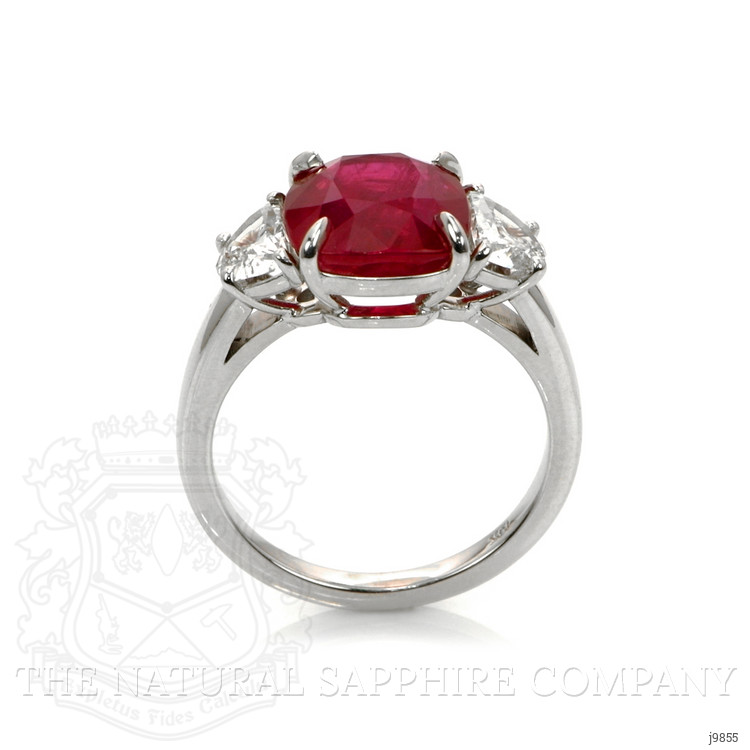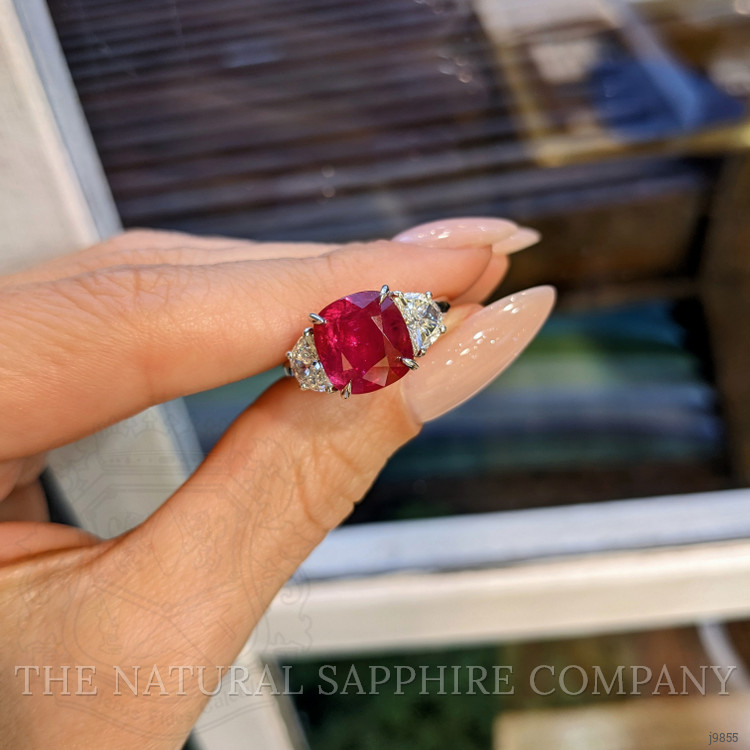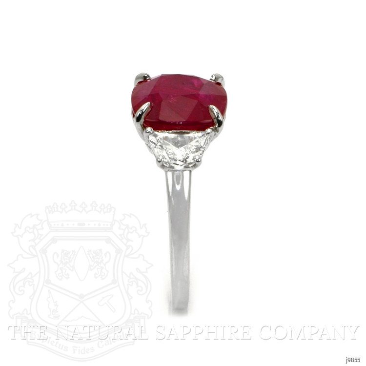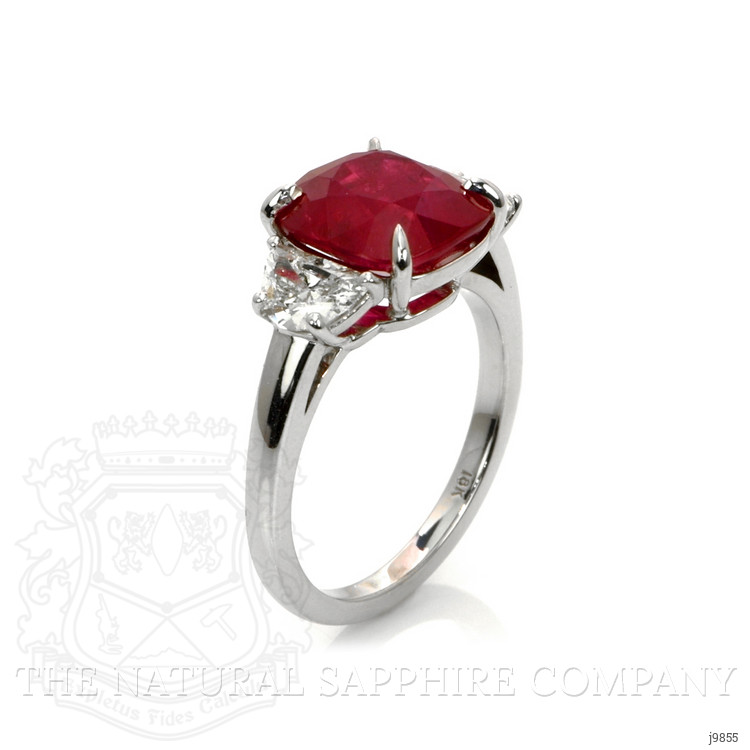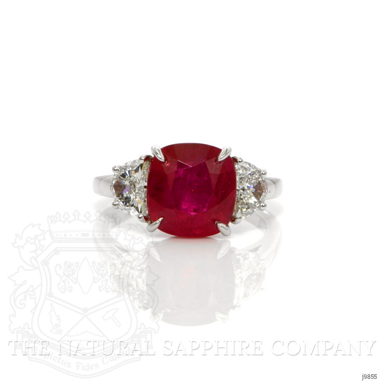 The ring primarily features a beautiful, transparent GIA certified Red 5.07 carat cushion shape red ruby with the dimensions of 9.86 x 9.34 x 5.90 mm and is mixed brilliant cut. It has a clarity grade of slightly included (evaluated at eye level), vivid color intensity, and an excellent polish. The origin of this ruby is Mozambique. Also featured in the ring are 2 white half moon shaped mixed brilliant cut natural diamonds, weighing a total of 0.81 carats. The natural diamonds have a clarity grade of vs1 - Very Slightly Included., F color The ring is entirely set in 18K white gold.