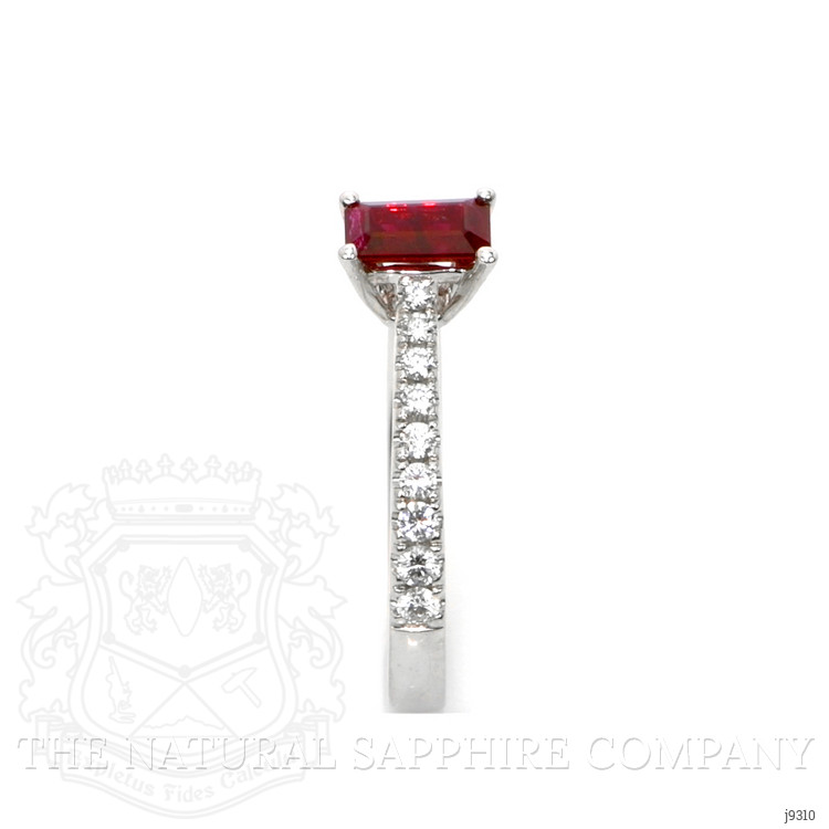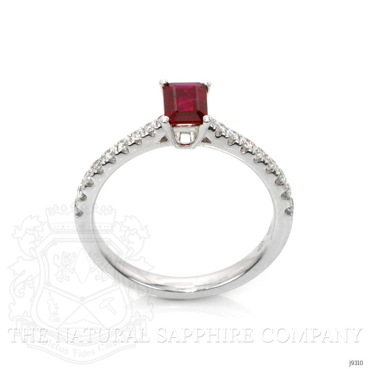 The ring primarily features a beautiful, transparent 0.54 carat emerald cut shape red ruby with the dimensions of 6.51 x 4.70 x 2.53 mm and is step cut. It has a clarity grade of very slightly included (evaluated at eye level), vivid color intensity, and an excellent polish. The origin of this ruby is Mozambique. Also featured in the ring are 16 white round shaped mixed brilliant cut natural diamonds, weighing a total of 0.27 carats. The natural diamonds have a clarity grade of vs1 - Very Slightly Included., F color The ring is entirely set in 18K white gold.