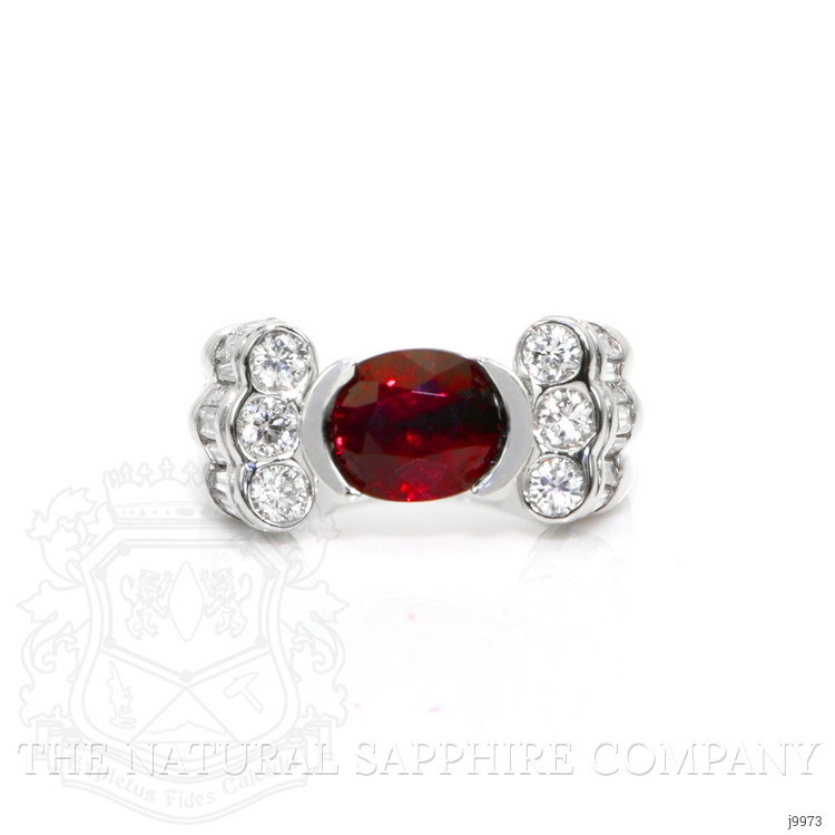 The men's ring primarily features a beautiful, transparent GRS certified Vivid Red “Pigeon’s Blood” 3.38 carat oval shape red ruby with the dimensions of 9.04 x 7.33 x 6.01 mm and is mixed brilliant cut. It has a clarity grade of very slightly included (evaluated at eye level), vivid color intensity, and an excellent polish. The origin of this ruby is Burma (Myanmar). Featured in the ring are 6 white round shaped mixed brilliant cut natural diamonds, weighing a total of 0.72 carats. The natural diamonds have a clarity grade of vs1 - Very Slightly Included., F color Also featured in the ring are 18 white bullet (tapered) shaped step cut natural diamonds, weighing a total of 2.70 carats. The natural diamonds have a clarity grade of vs1 - Very Slightly Included., F color The ring is entirely set in 18K white gold.
